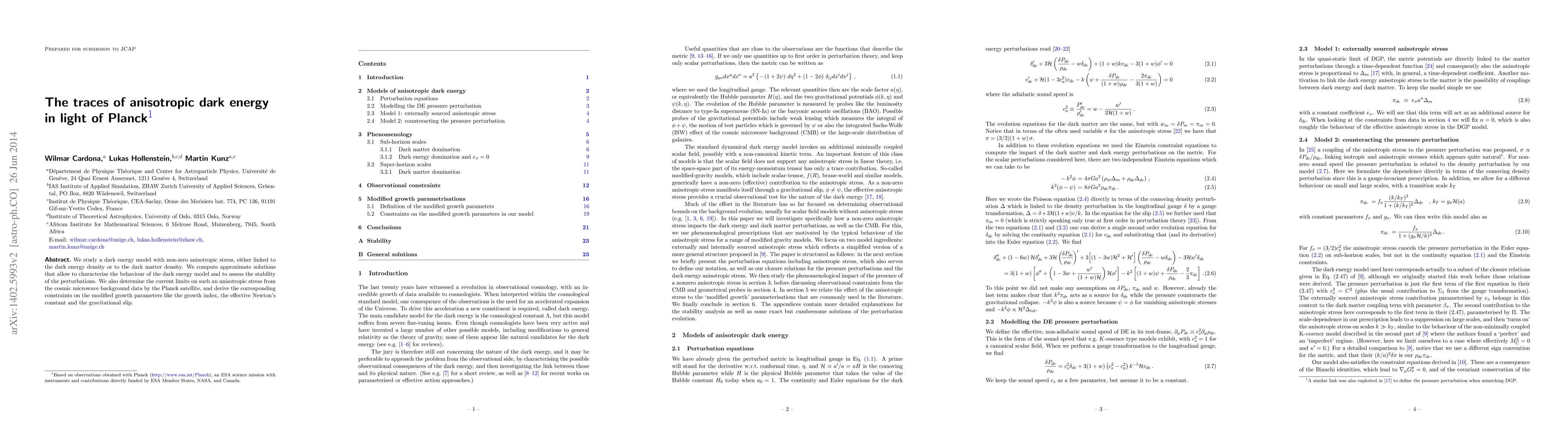 This paper investigates a dark energy model with anisotropic stress, analyzing its behavior and stability, and determines the current limits on this anisotropic stress using Planck satellite data, thereby constraining modified growth parameters.