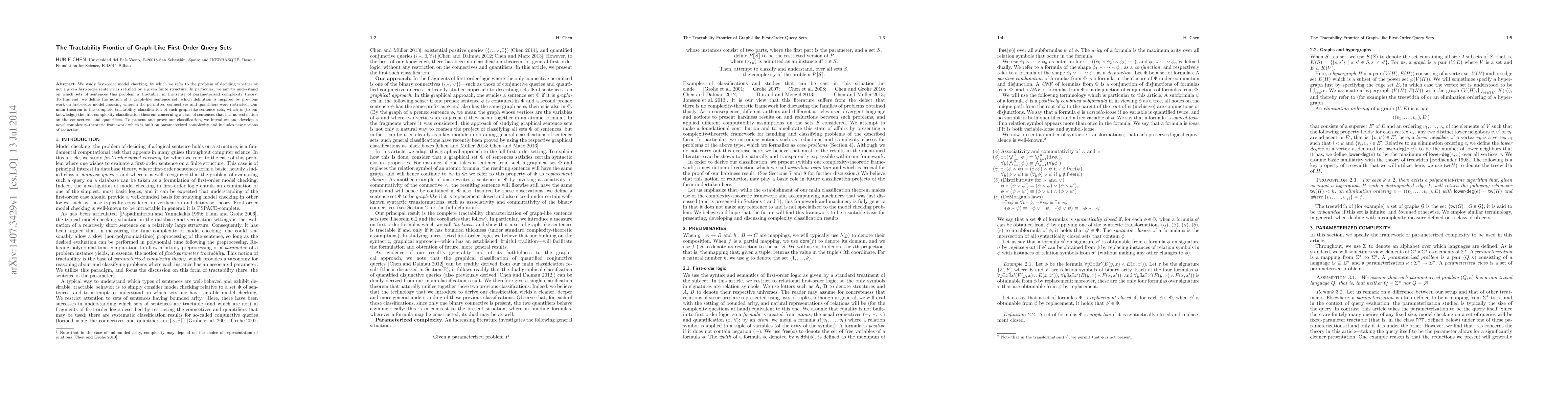 We study first-order model checking, by which we refer to the problem of deciding whether or not a given first-order sentence is satisfied by a given finite structure. In particular, we aim to understand on which sets of sentences this problem is tractable, in the sense of parameterized complexity theory. To this end, we define the notion of a graph-like sentence set, which definition is inspired by previous work on first-order model checking wherein the permitted connectives and quantifiers were restricted. Our main theorem is the complete tractability classification of such graph-like sentence sets, which is (to our knowledge) the first complexity classification theorem concerning a class of sentences that has no restriction on the connectives and quantifiers. To present and prove our classification, we introduce and develop a novel complexity-theoretic framework which is built on parameterized complexity and includes new notions of reduction.
