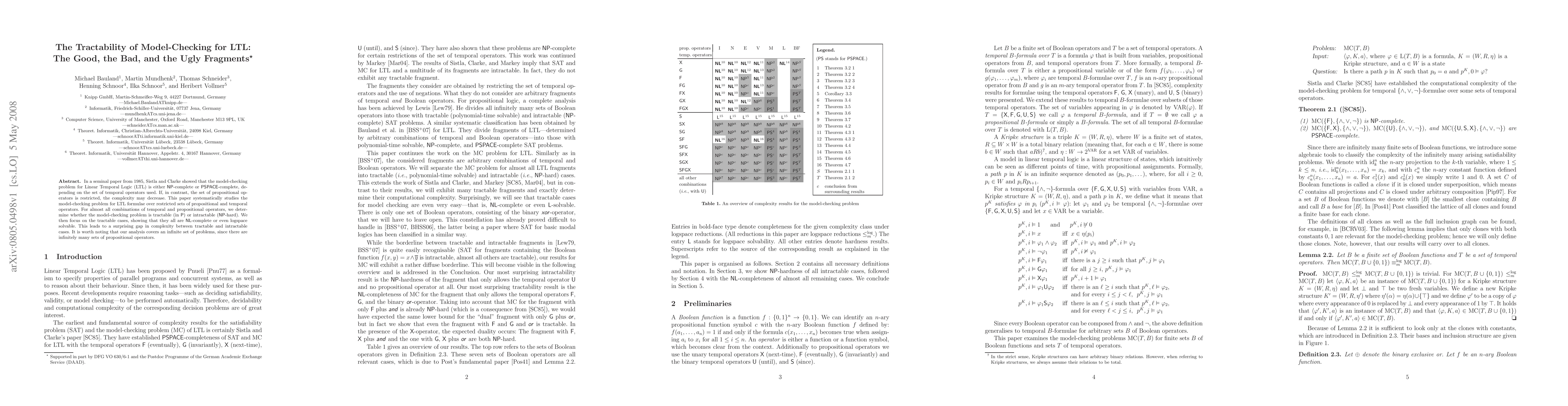 In a seminal paper from 1985, Sistla and Clarke showed that the model-checking problem for Linear Temporal Logic (LTL) is either NP-complete or PSPACE-complete, depending on the set of temporal operators used. If, in contrast, the set of propositional operators is restricted, the complexity may decrease. This paper systematically studies the model-checking problem for LTL formulae over restricted sets of propositional and temporal operators. For almost all combinations of temporal and propositional operators, we determine whether the model-checking problem is tractable (in P) or intractable (NP-hard). We then focus on the tractable cases, showing that they all are NL-complete or even logspace solvable. This leads to a surprising gap in complexity between tractable and intractable cases. It is worth noting that our analysis covers an infinite set of problems, since there are infinitely many sets of propositional operators.