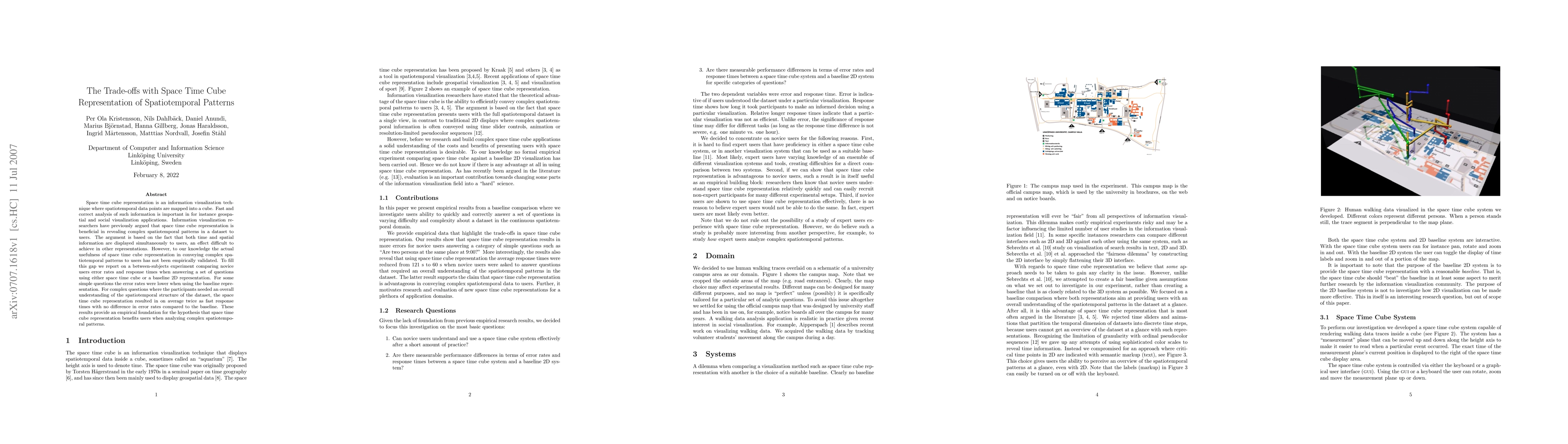 This study investigates the trade-offs of space time cube representation in analyzing spatiotemporal patterns, finding that while it improves response times for complex questions, it can lead to higher error rates for simpler questions compared to a 2D baseline. The results suggest space time cubes are beneficial for understanding overall spatiotemporal structures.