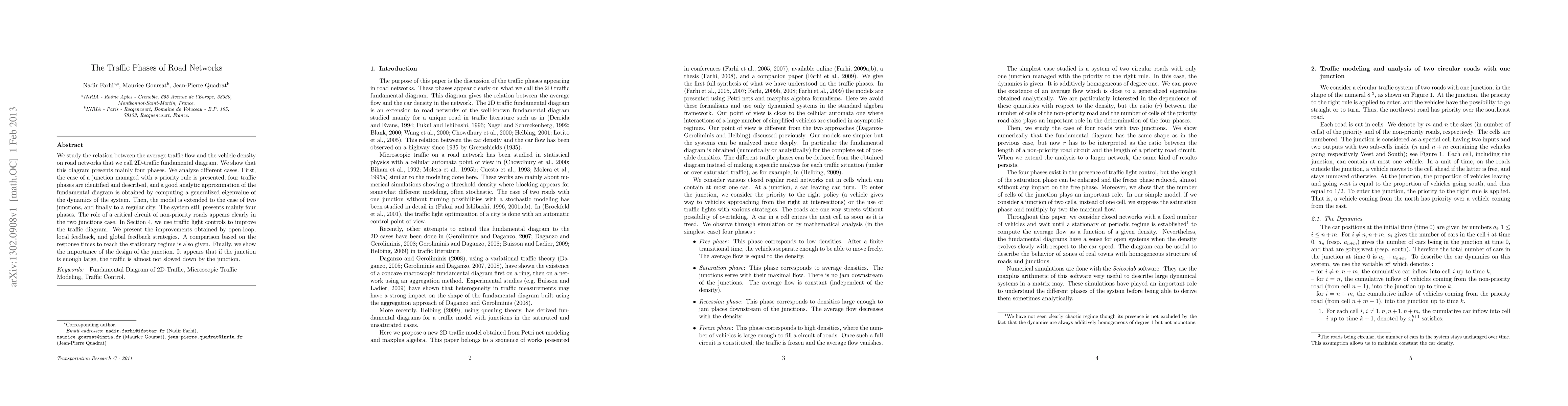 A study on road network traffic flow reveals that average traffic flow is related to vehicle density in four distinct phases, with improvements made using different feedback strategies to optimize traffic light controls.