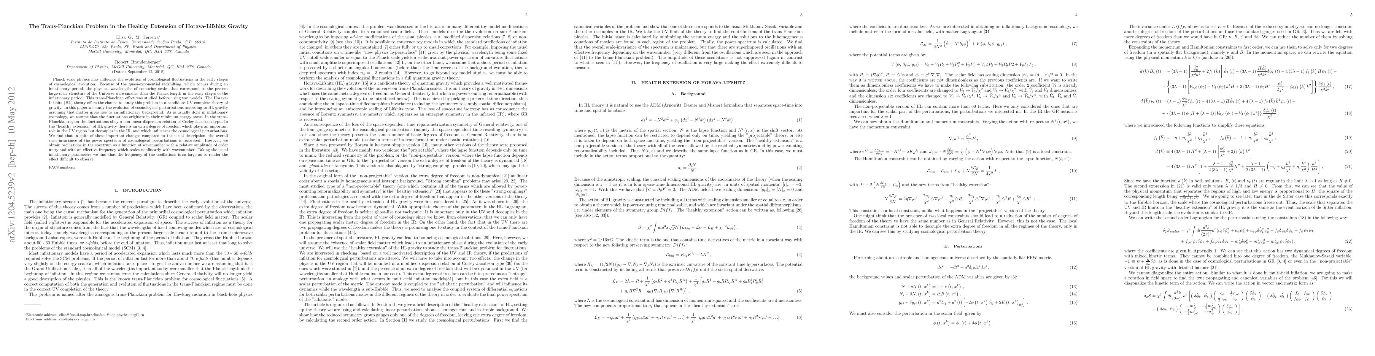 This paper explores the trans-Planckian problem in the "healthy extension" of Horava-Lifshitz gravity, finding that despite an extra degree of freedom influencing UV region perturbations, the power spectrum of cosmological perturbations remains scale-invariant with observable oscillations at a frequency too high to detect.
