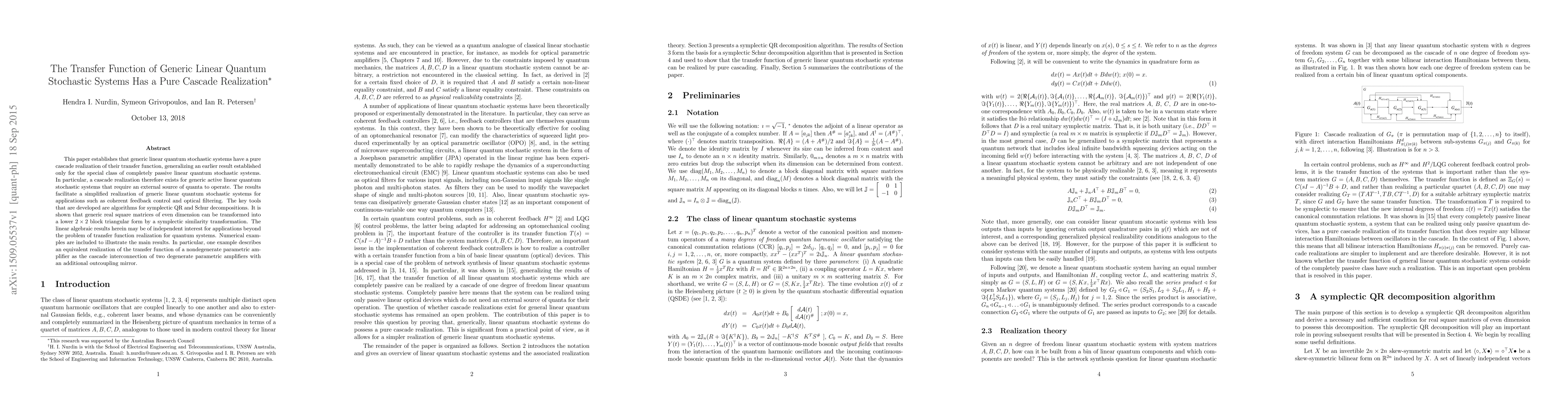 This paper proves that generic linear quantum stochastic systems possess a pure cascade realization for their transfer function, extending previous findings for completely passive systems. The developed algorithms for symplectic QR and Schur decompositions enable simplified realizations for applications like coherent feedback control and optical filtering.