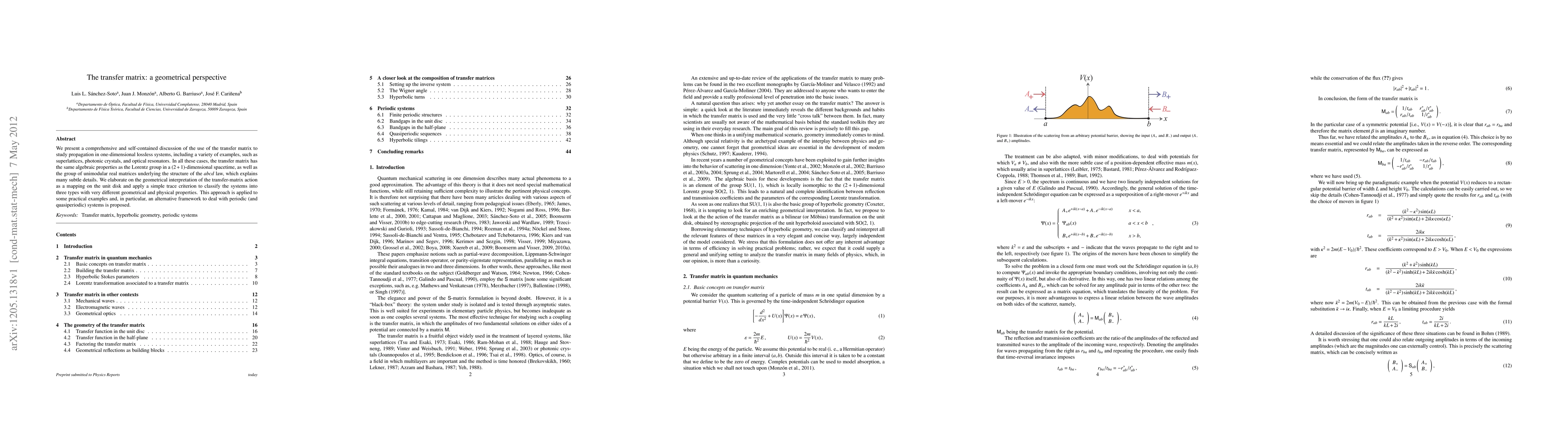 This paper explores the transfer matrix method for analyzing propagation in one-dimensional lossless systems, revealing its algebraic equivalence to the Lorentz group and the abcd law. It proposes a geometrical interpretation and a trace criterion to classify systems, and introduces an alternative framework for periodic and quasiperiodic structures.
