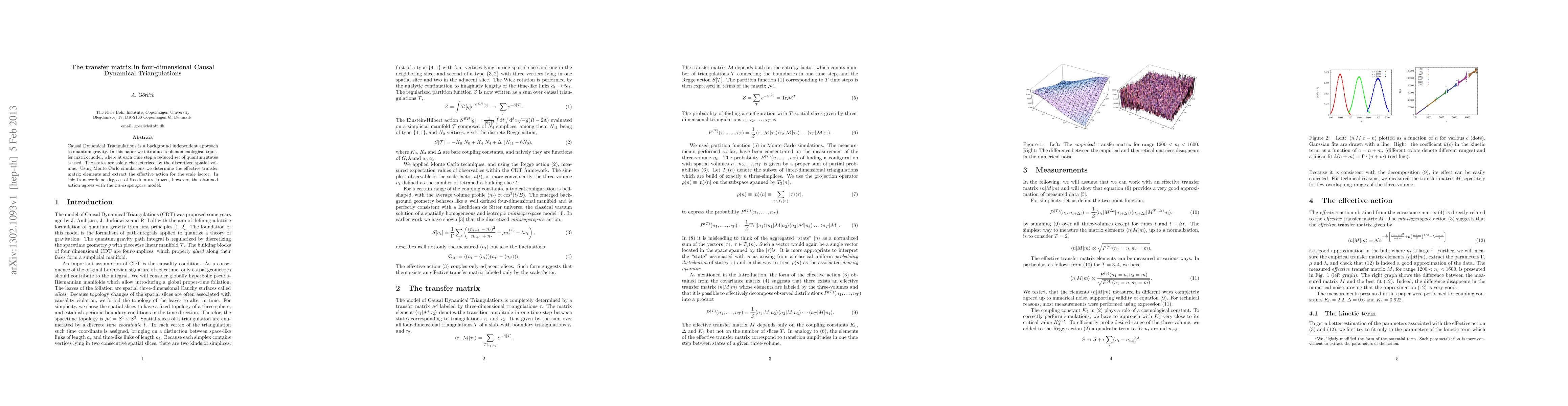 This paper introduces a transfer matrix model for four-dimensional Causal Dynamical Triangulations, a background-independent approach to quantum gravity, using Monte Carlo simulations to determine effective transfer matrix elements and extract the effective action for the scale factor, which aligns with the minisuperspace model.