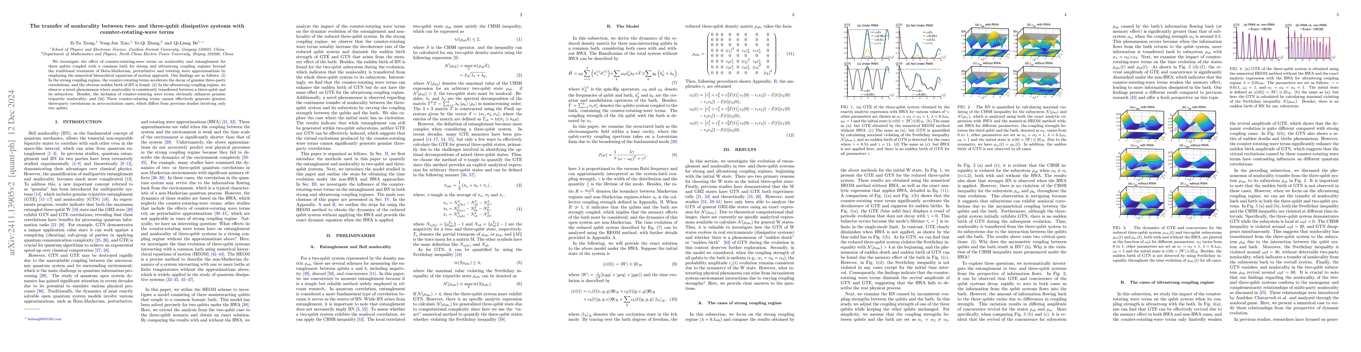 We investigate the effect of counter-rotating-wave terms on bell nonlocality (BN) and entanglement for three qubits coupled with a Lorentz-broadened cavity mode at zero temperature for strong and ultrastrong coupling regimes by employing exact numerical hierarchical equations of motion approach (HEOM). Our findings are as follows: (i) the counter-rotating wave terms significantly increase the rate of decoherence in the three-qubit system; (ii) a consistent transfer of Bell nonlocality between the three-qubit state and its subsystem is observed when the interaction between the qubits and the bath is asymmetrical, which provides effective numerical evidence for the monogamy and complementarity of multipartite nonlocality; (iii) the counter-rotating wave terms can enhance genuine tripartite nonlocality in the qubit system; and (iv) these terms do not significantly generate three-party correlations in zero-excitation cases, which differs from previous studies involving two qubits.