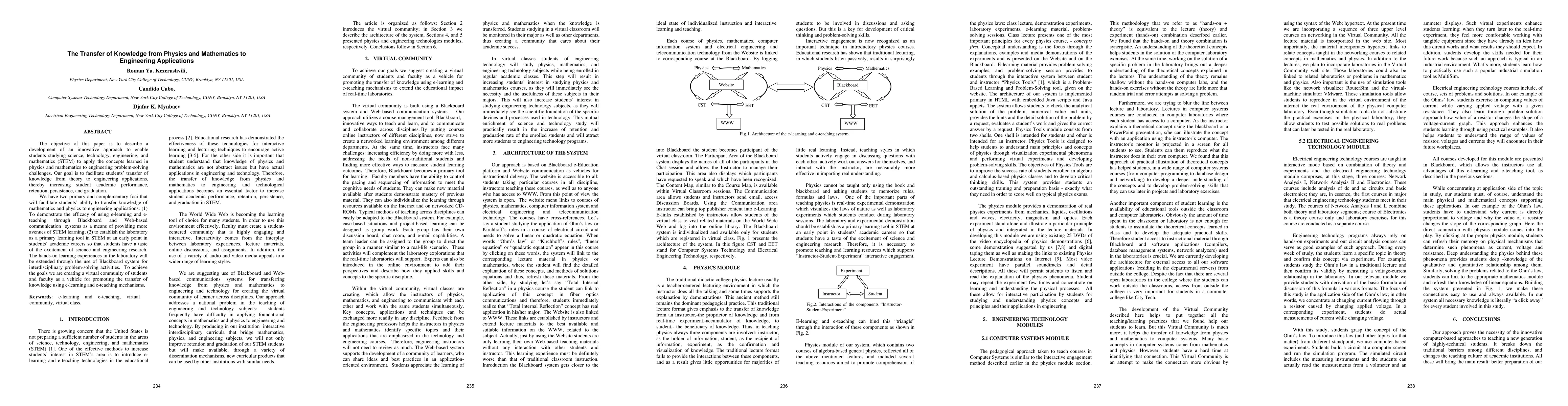 The objective of this paper is to describe a development of an innovative approach to enable students studying science, technology, engineering, and mathematics (STEM) to apply the concepts learned in physics and mathematics to engineering problem-solving challenges. Our goal is to facilitate students transfer of knowledge from theory to engineering applications, thereby increasing student academic performance, retention, persistence, and graduation. To achieve the goal we are creating a virtual community of students and faculty as a vehicle for promoting the transfer of knowledge using e-learning and e-teaching mechanisms.