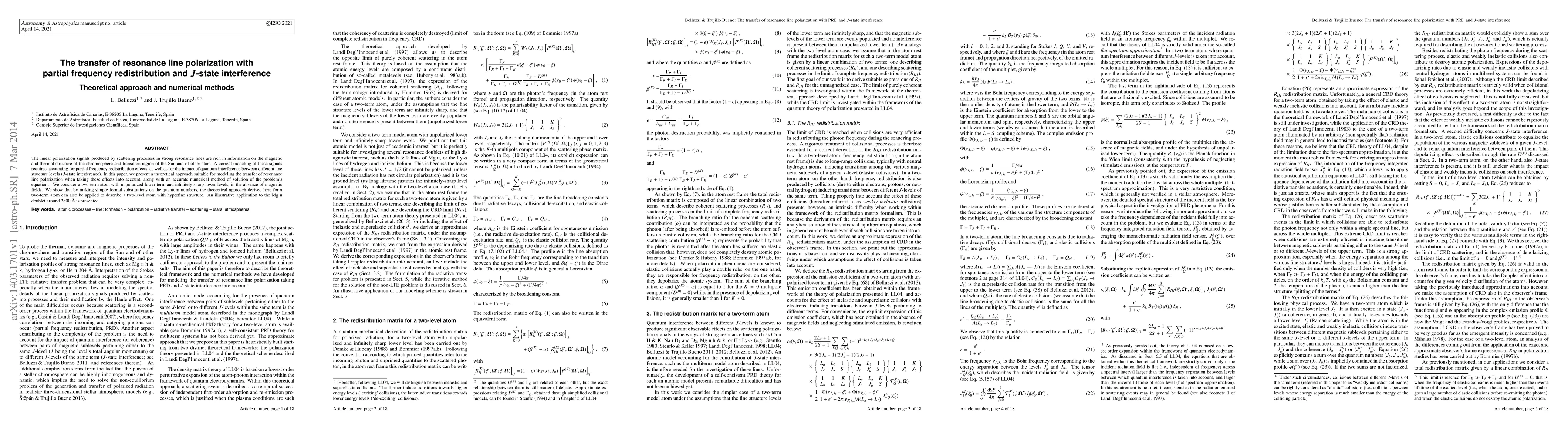 This paper develops a theoretical framework for modeling the transfer of resonance line polarization, incorporating partial frequency redistribution and J-state interference effects. It also presents a numerical method for solving the relevant equations, demonstrating its applicability to the MgII doublet around 2800A.