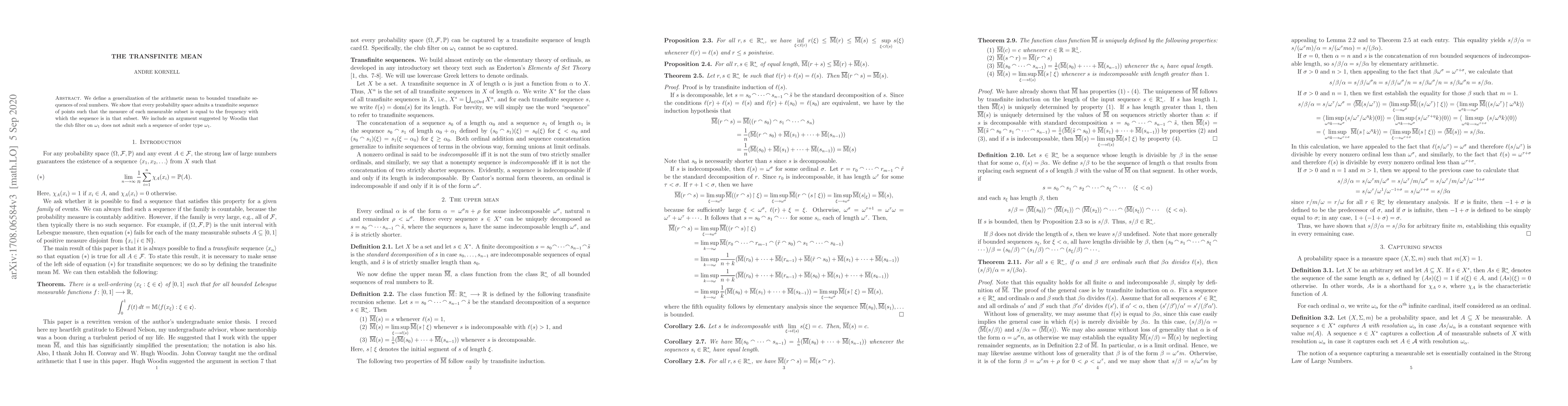 Summary: The paper generalizes the arithmetic mean to transfinite sequences of real numbers, demonstrating that probability spaces can accommodate such sequences where subset measures align with sequence frequencies. It also presents Woodin's argument refuting the existence of a club filter sequence of order type $\omega_1$.