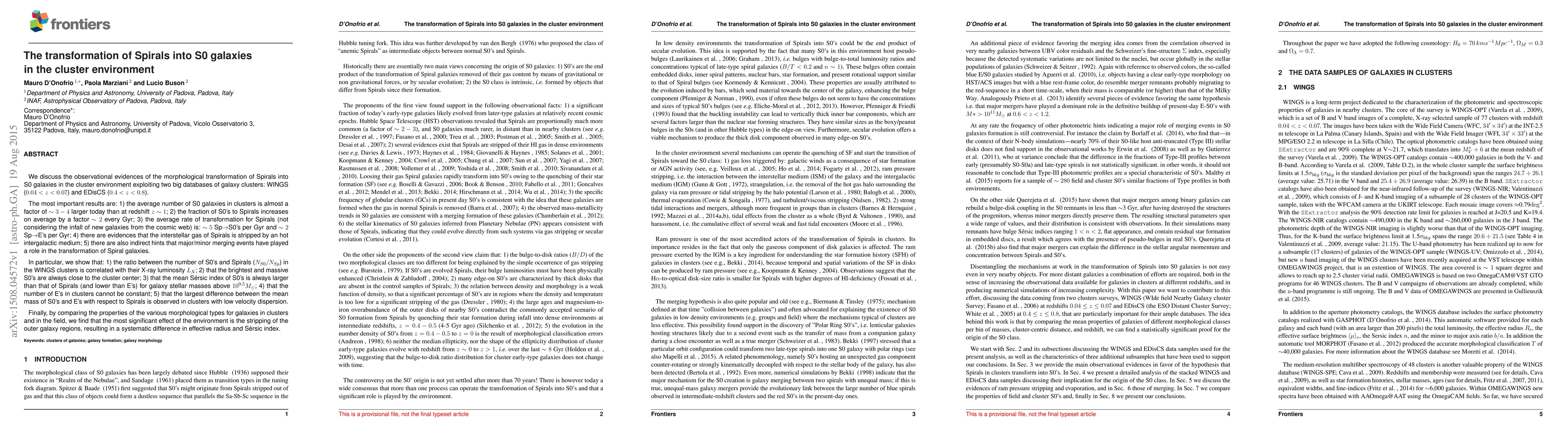 We discuss the observational evidences of the morphological transformation of Spirals into S0 galaxies in the cluster environment exploiting two big databases of galaxy clusters: WINGS (0.04 < z < 0.07) and EDisCS (0.4 < z < 0.8). The most important results are: 1) the average number of S0 galaxies in clusters is almost a factor of $\sim 3 - 4$ larger today than at redshift $z \sim 1$; 2) the fraction of S0's to Spirals increases on average by a factor $\sim$ 2 every Gyr; 3) the average rate of transformation for Spirals (not considering the infall of new galaxies from the cosmic web) is: $\sim$ 5 Sp into S0's per Gyr and $\sim$ 2 Sp into E's per Gyr; 4) there are evidences that the interstellar gas of Spirals is stripped by an hot intergalactic medium; 5) there are also indirect hints that major/minor merging events have played a role in the transformation of Spiral galaxies. In particular, we show that: 1) the ratio between the number of S0's and Spirals (NS0/NSp) in the WINGS clusters is correlated with their X-ray luminosity $L_X$ ; 2) that the brightest and massive S0's are always close to the cluster center; 3) that the mean Sersic index of S0's is always larger than that of Spirals (and lower than E's) for galaxy stellar masses above $10^9.5$ Msun; 4) that the number of E's in clusters cannot be constant; 5) that the largest difference between the mean mass of S0's and E's with respect to Spirals is observed in clusters with low velocity dispersion. Finally, by comparing the properties of the various morphological types for galaxies in clusters and in the field, we find that the most significant effect of the environment is the stripping of the outer galaxy regions, resulting in a systematic difference in effective radius and Sersic index.