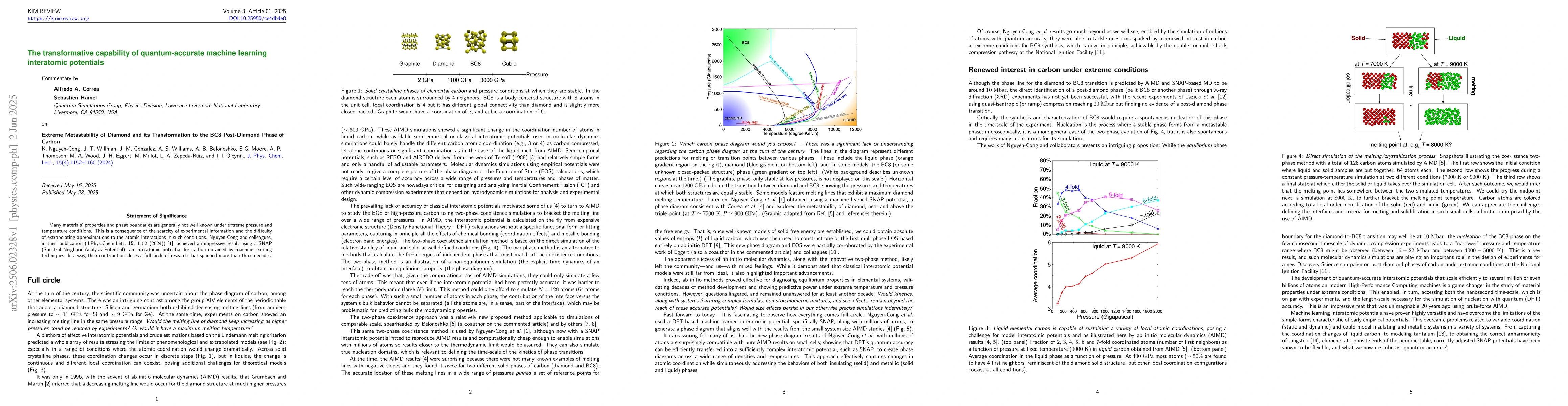 Many materials's properties and phase boundaries are generally not well known under extreme pressure and temperature conditions. This is a consequence of the scarcity of experimental information and the difficulty of extrapolating approximations to the atomic interactions in such conditions. Nguyen-Cong and colleagues, in their publication (J.Phys.Chem.Lett. 15, 1152 (2024)), achieved an impressive result using a SNAP (Spectral Neighbor Analysis Potential), an interatomic potential for carbon obtained by machine learning techniques. In a way, their contribution closes a full circle of research that spanned more than three decades.