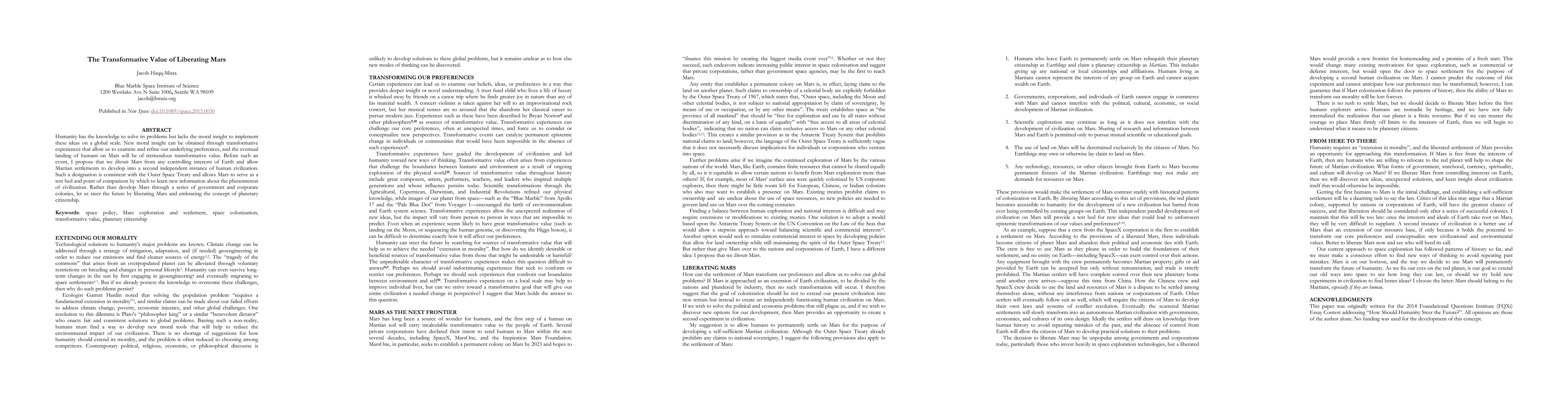 This paper argues that liberating Mars from Earth's controlling interests and allowing Martian settlements to develop independently can provide transformative moral insights for humanity. It suggests that Mars can serve as a test bed for understanding civilization, fostering planetary citizenship instead of government and corporate colonies.