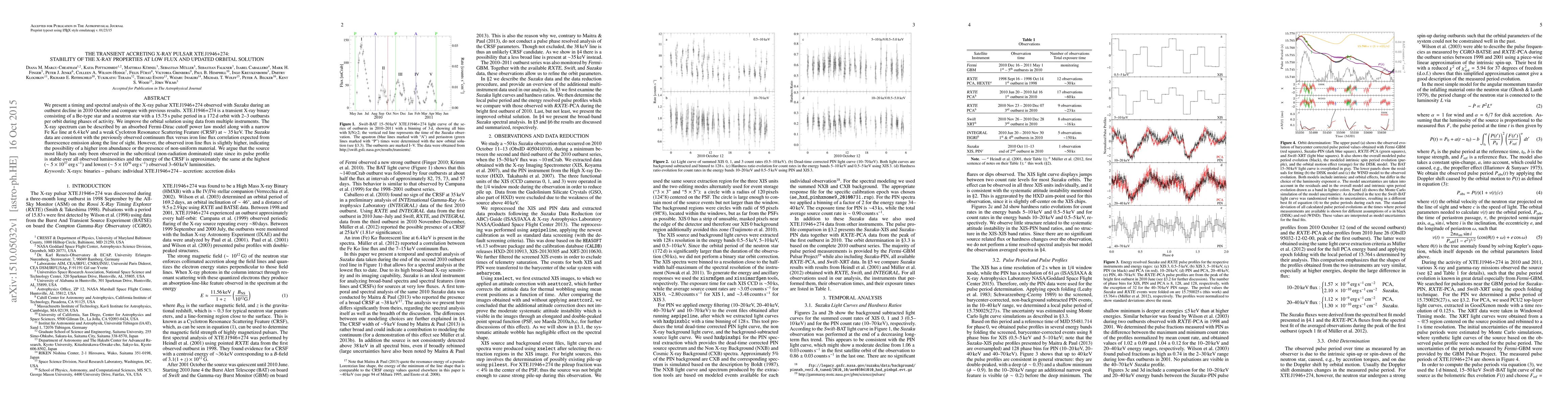 We present a timing and spectral analysis of the X-ray pulsar XTE J1946+274 observed with Suzaku during an outburst decline in 2010 October and compare with previous results. XTE J1946+274 is a transient X-ray binary consisting of a Be-type star and a neutron star with a 15.75 s pulse period in a 172 d orbit with 2-3 outbursts per orbit during phases of activity. We improve the orbital solution using data from multiple instruments. The X-ray spectrum can be described by an absorbed Fermi-Dirac cutoff power law model along with a narrow Fe K line at 6.4 keV and a weak Cyclotron Resonance Scattering Feature (CRSF) at ~35 keV. The Suzaku data are consistent with the previously observed continuum flux versus iron line flux correlation expected from fluorescence emission along the line of sight. However, the observed iron line flux is slightly higher, indicating the possibility of a higher iron abundance or the presence of non-uniform material. We argue that the source most likely has only been observed in the subcritical (non-radiation dominated) state since its pulse profile is stable over all observed luminosities and the energy of the CRSF is approximately the same at the highest (~$5 \times 10^{37} $erg s$^{-1}$) and lowest (~$5 \times 10^{36} $erg s$^{-1}$) observed 3-60 keV luminosities.