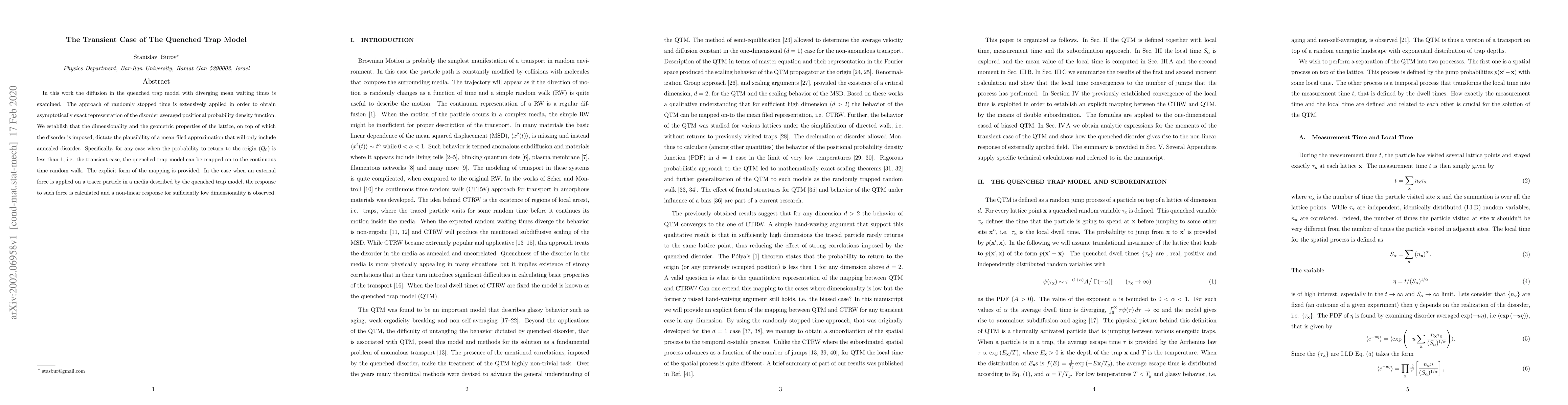 In this work the diffusion in the quenched trap model with diverging mean waiting times is examined. The approach of randomly stopped time is extensively applied in order to obtain asymptotically exact representation of the disorder averaged positional probability density function. We establish that the dimensionality and the geometric properties of the lattice, on top of which the disorder is imposed, dictate the plausibility of a mean-filed approximation that will only include annealed disorder. Specifically, for any case when the probability to return to the origin ($Q_0$) is less than $1$, i.e. the transient case, the quenched trap model can be mapped on to the continuous time random walk. The explicit form of the mapping is provided. In the case when an external force is applied on a tracer particle in a media described by the quenched trap model, the response to such force is calculated and a non-linear response for sufficiently low dimensionality is observed.