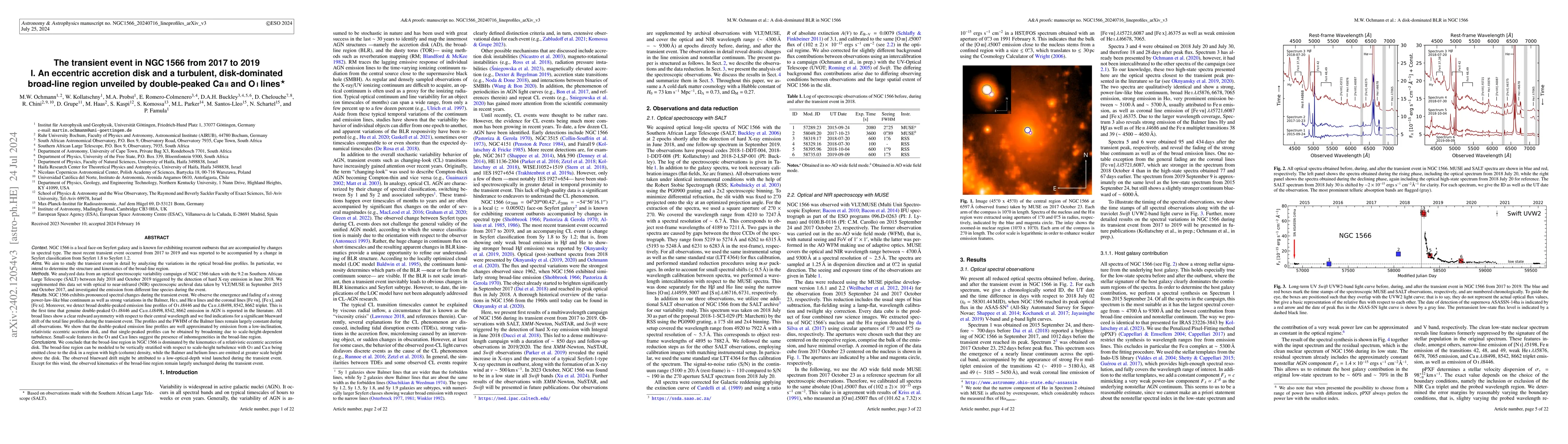 NGC 1566 experienced a transient event from 2017 to 2019, revealing an eccentric accretion disk and a turbulent broad-line region through double-peaked Ca II and O I lines. The study shows a significant redward asymmetry in broad lines and suggests the presence of an eccentric accretion disk and scale-height dependent turbulence in the broad-line region.