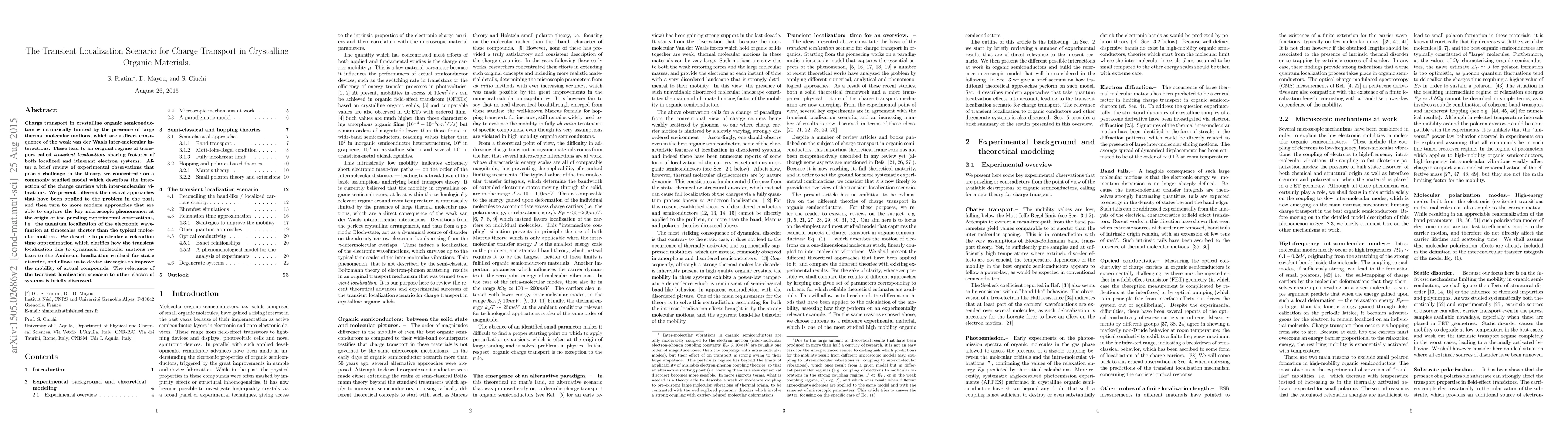 This paper explores charge transport in crystalline organic semiconductors, focusing on the transient localization phenomenon caused by weak van der Waals interactions and large thermal molecular motions. It reviews theoretical approaches to understand this behavior, highlighting a relaxation time approximation that connects transient localization to Anderson localization, and discusses strategies to enhance material mobility.