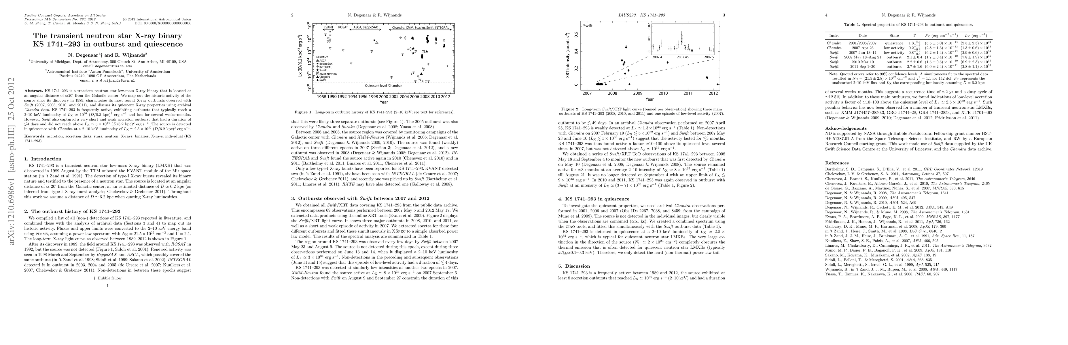 KS 1741-293 is a transient neutron star X-ray binary that frequently exhibits outbursts reaching luminosities up to Lx~1E36 erg/s, while also showing a very short, weak outburst of Lx~5E34 erg/s. In quiescence, it is detected at a lower luminosity of Lx~2.5E32 erg/s.
