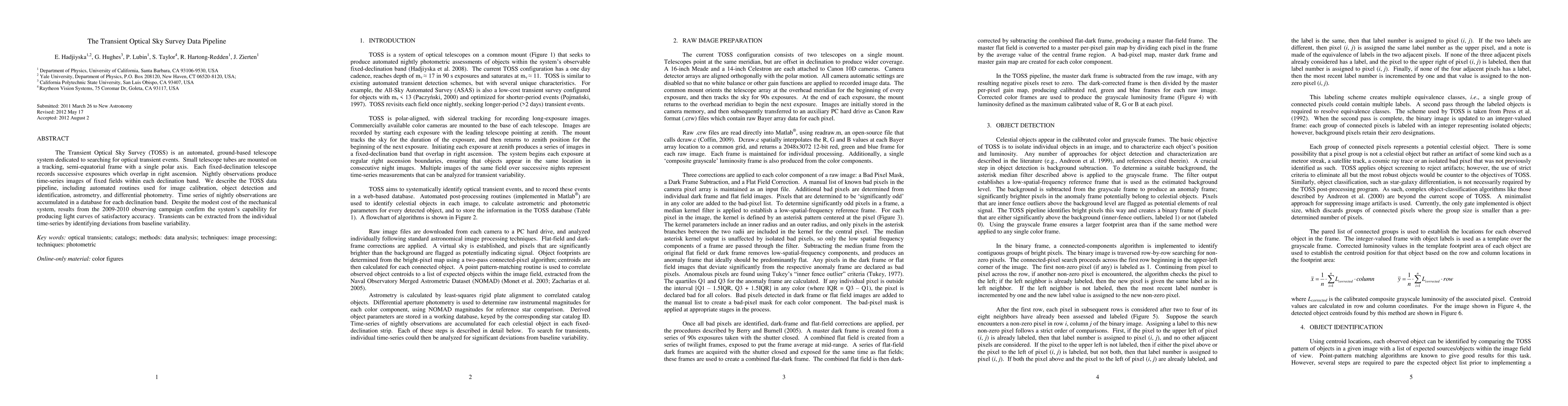 The Transient Optical Sky Survey (TOSS) is an automated, ground-based telescope system dedicated to searching for optical transient events. Small telescope tubes are mounted on a tracking, semi-equatorial frame with a single polar axis. Each fixed declination telescope records successive exposures which overlap in right ascension. Nightly observations produce time-series images of fixed fields within each declination band. We describe the TOSS data pipeline, including automated routines used for image calibration, object detection and identification, astrometry, and differential photometry. Time series of nightly observations are accumulated in a database for each declination band. Despite the modest cost of the mechanical system, results from the 2009-2010 observing campaign confirm the system's capability for producing light curves of satisfactory accuracy. Transients can be extracted from the individual time-series by identifying deviations from baseline variability.