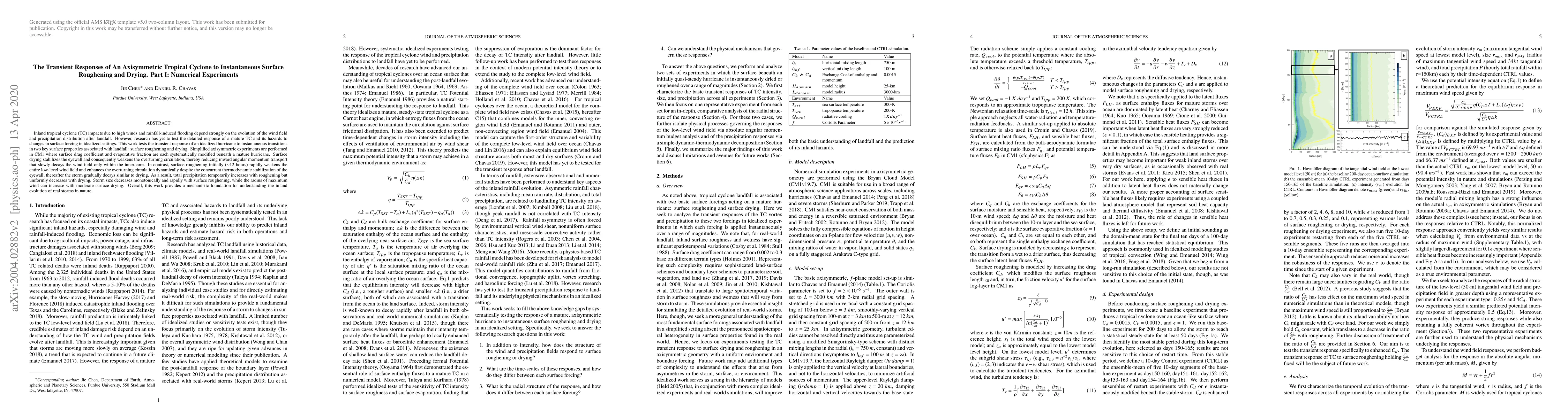This study investigates the transient responses of an idealized axisymmetric tropical cyclone to instantaneous surface roughening and drying using numerical experiments. Surface roughening rapidly weakens the entire low-level wind field initially, while surface drying stabilizes the eyewall and reduces inward angular momentum transport, leading to a slower decay of the wind field.