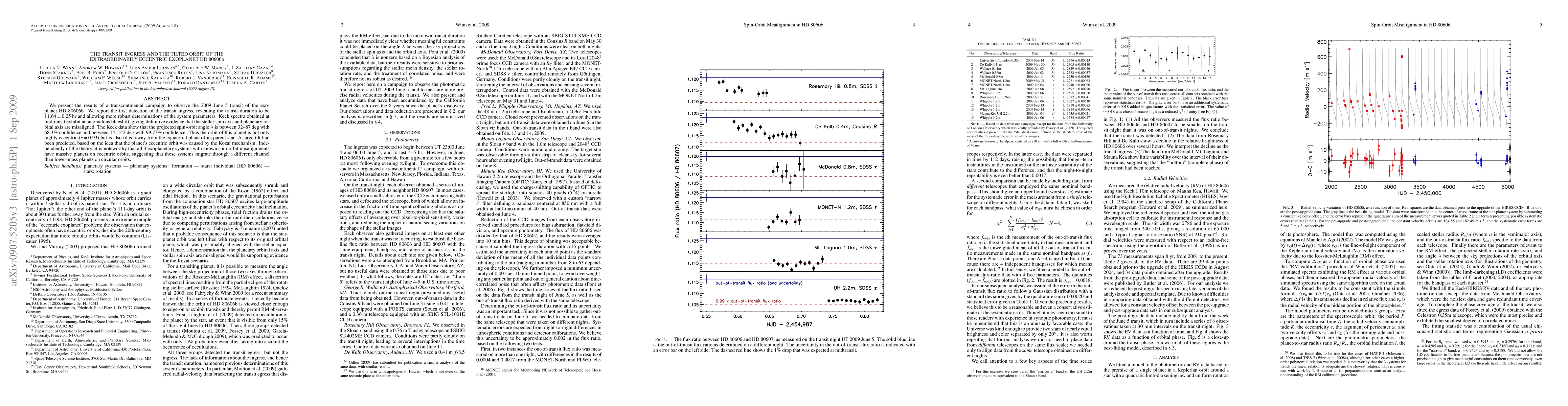 This study details a 2009 observation campaign of the exoplanet HD 80606b's transit, detecting the ingress for the first time. The results show an unusually tilted orbit (32-142 degrees) alongside its high eccentricity (0.93), suggesting different migration patterns for massive, eccentric exoplanets. Anomalous stellar blueshift in Keck spectra confirmed the orbital misalignment.