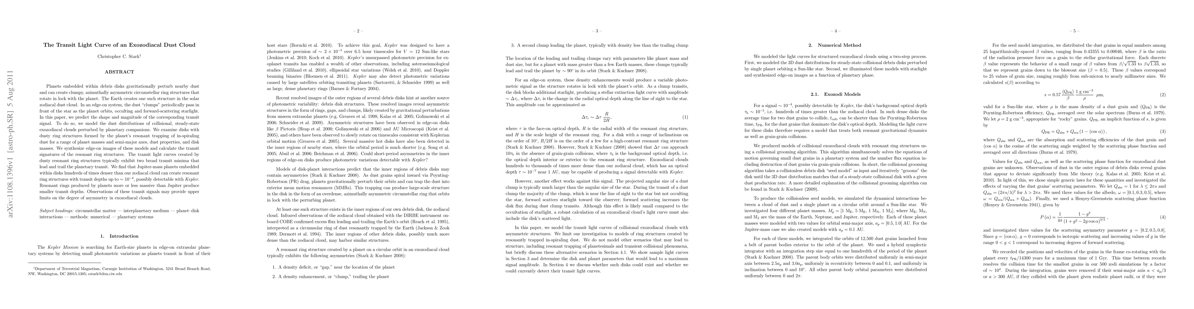 This paper predicts the shape and magnitude of transit signals from exozodiacal dust clouds perturbed by planetary companions, finding that Jupiter-mass planets can create detectable transit depths with certain disk properties.