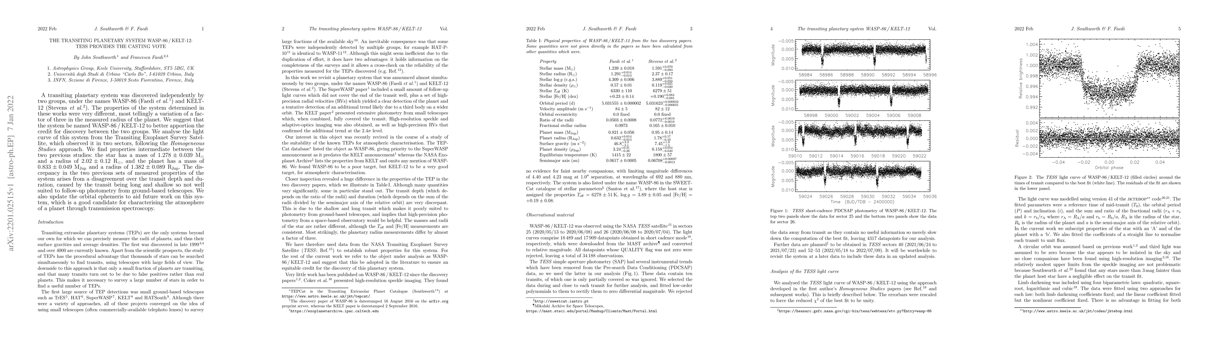 The WASP-86/KELT-12 transiting planetary system, discovered by two independent groups, shows significant discrepancies in previous measurements. TESS data reconciles these differences, providing intermediate values for the star and planet, and suggesting the system is a promising candidate for atmospheric characterization.