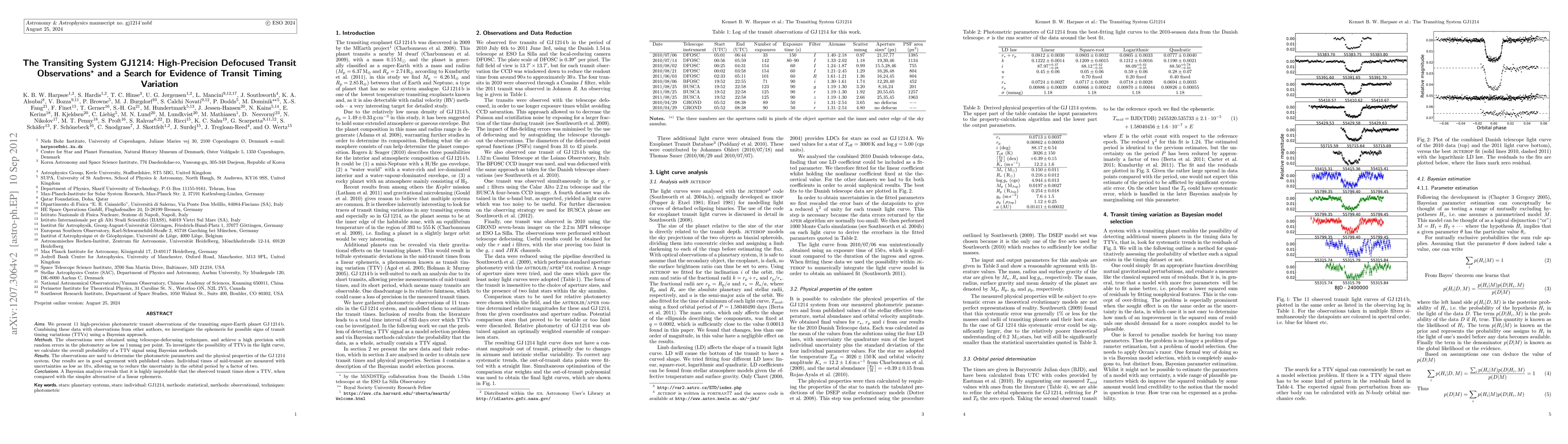 Aims: We present 11 high-precision photometric transit observations of the transiting super-Earth planet GJ1214b. Combining these data with observations from other authors, we investigate the ephemeris for possible signs of transit timing variations (TTVs) using a Bayesian approach. Methods: The observations were obtained using telescope-defocusing techniques, and achieve a high precision with random errors in the photometry as low as 1mmag per point. To investigate the possibility of TTVs in the light curve, we calculate the overall probability of a TTV signal using Bayesian methods. Results: The observations are used to determine the photometric parameters and the physical properties of the GJ1214 system. Our results are in good agreement with published values. Individual times of mid-transit are measured with uncertainties as low as 10s, allowing us to reduce the uncertainty in the orbital period by a factor of two. Conclusions: A Bayesian analysis reveals that it is highly improbable that the observed transit times is explained by TTV, when compared with the simpler alternative of a linear ephemeris.