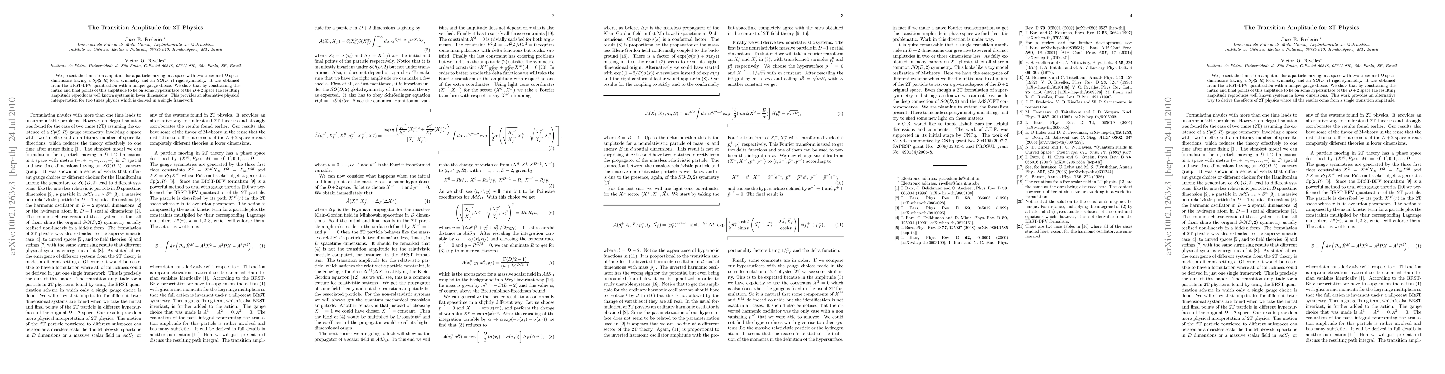 We present the transition amplitude for a particle moving in a space with two times and D space dimensions having a Sp(2,R) local symmetry and an SO(D,2) rigid symmetry. It was obtained from the BRST-BFV quantization with a unique gauge choice. We show that by constraining the initial and final points of this amplitude to lie on some hypersurface of the D+2 space the resulting amplitude reproduces well known systems in lower dimensions. This provides an alternative physical interpretation for two times physics which is derived in a single framework.
