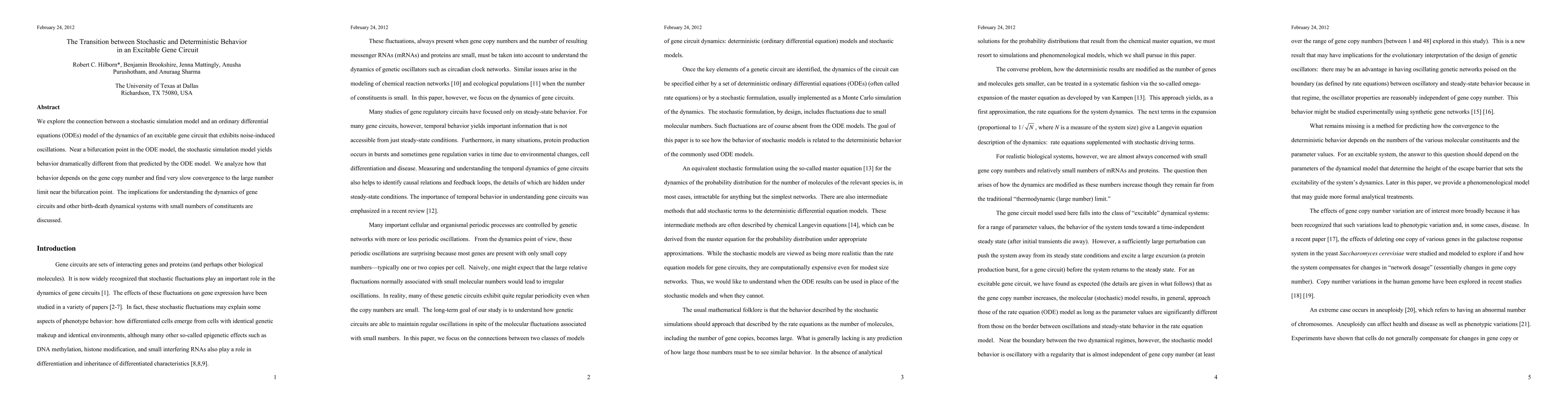 This paper investigates the transition between stochastic and deterministic behaviors in an excitable gene circuit, finding significant differences near a bifurcation point. It reveals slow convergence to deterministic predictions as gene copy number increases, highlighting implications for understanding gene circuit dynamics.