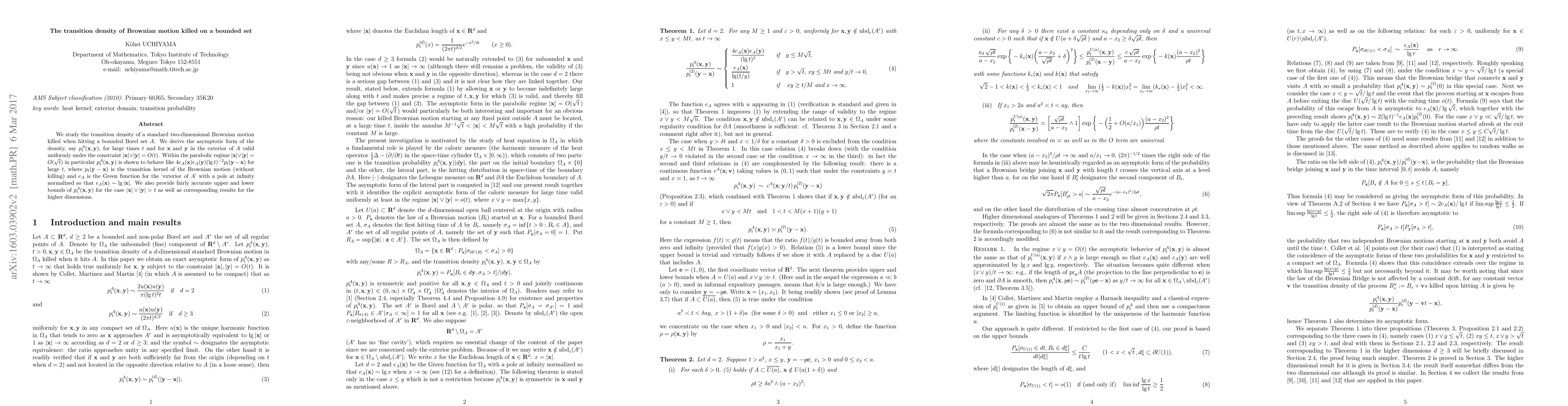 We study the transition density of a standard two-dimensional Brownian motion killed when hitting a bounded Borel set $A$. We derive the asymptotic form of the density, say $p^A_t({\bf x},{\bf y})$, for large times $t$ and for ${\bf x}$ and ${\bf y}$ in the exterior of $A$ valid uniformly under the constraint $|{\bf x}|\vee |{\bf y}| =O(t)$. Within the parabolic regime $|{\bf x}|\vee |{\bf y}| = O(\sqrt t)$ in particular $p^A_t({\bf x},{\bf y})$ is shown to behave like $4e_A({\bf x})e_A({\bf y}) (\lg t)^{-2} p_t({\bf y}-{\bf x})$ for large $t$, where $p_t({\bf y}-{\bf x})$ is the transition kernel of the Brownian motion (without killing) and $e_A$ is the Green function for the \lq exterior of $A$' with a pole at infinity normalized so that $e_A({\bf x}) \sim \lg |{\bf x}|$. We also provide fairly accurate upper and lower bounds of $p^A_t({\bf x},{\bf y})$ for the case $|{\bf x}|\vee |{\bf y}|>t$ as well as corresponding results for the higher dimensions.