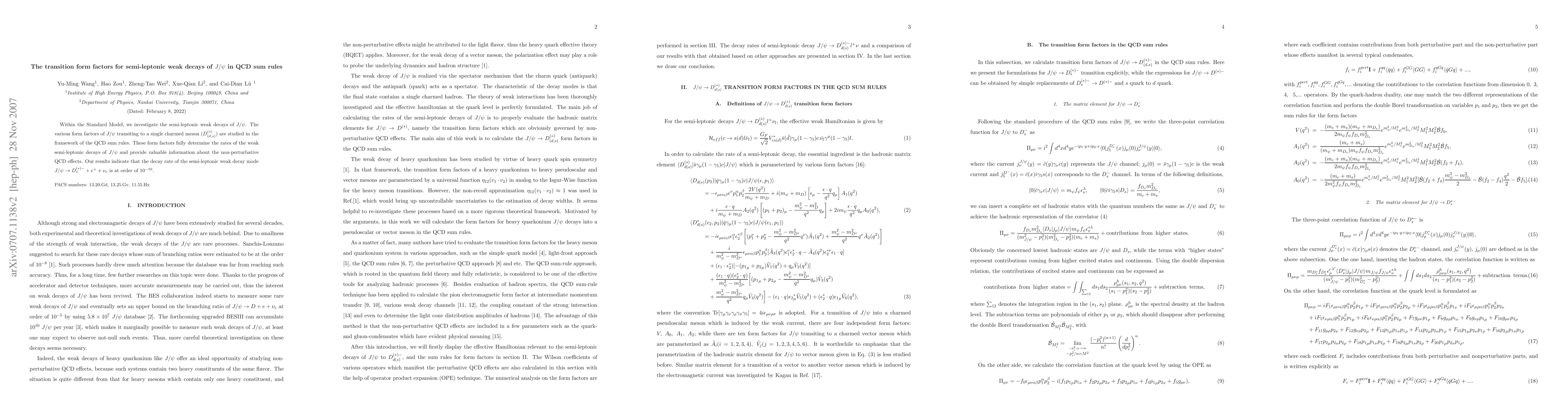 The paper investigates form factors for $J/ ho$ decays in QCD sum rules, finding a semi-leptonic decay rate of approximately $10^{-10}$.