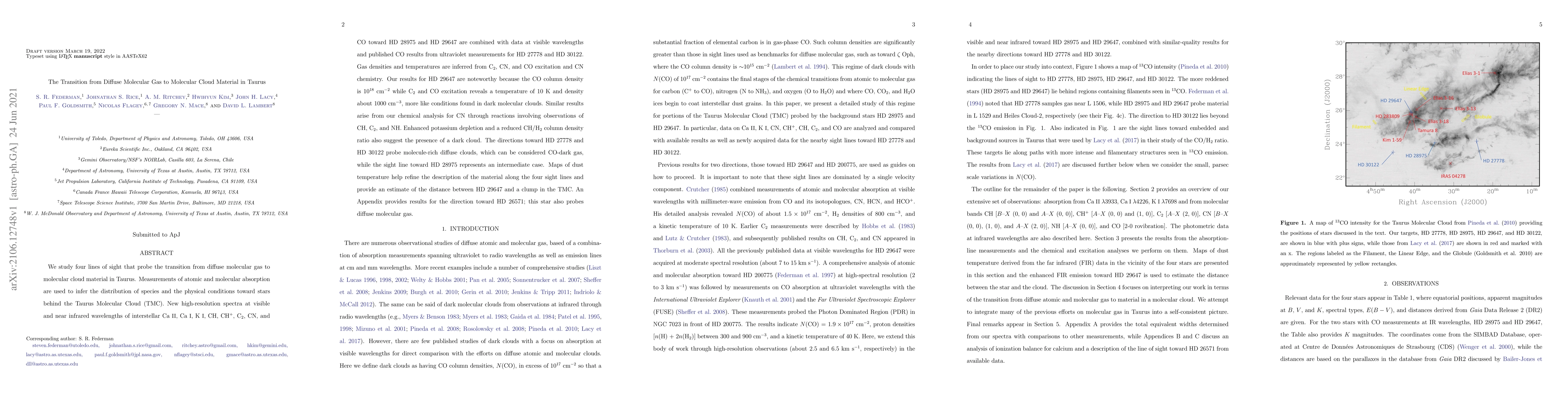This study investigates the transition from diffuse molecular gas to molecular cloud material in Taurus using high-resolution spectra and absorption measurements. Results for HD29647 indicate conditions similar to dark molecular clouds, while other lines of sight show varying degrees of molecular cloud characteristics.