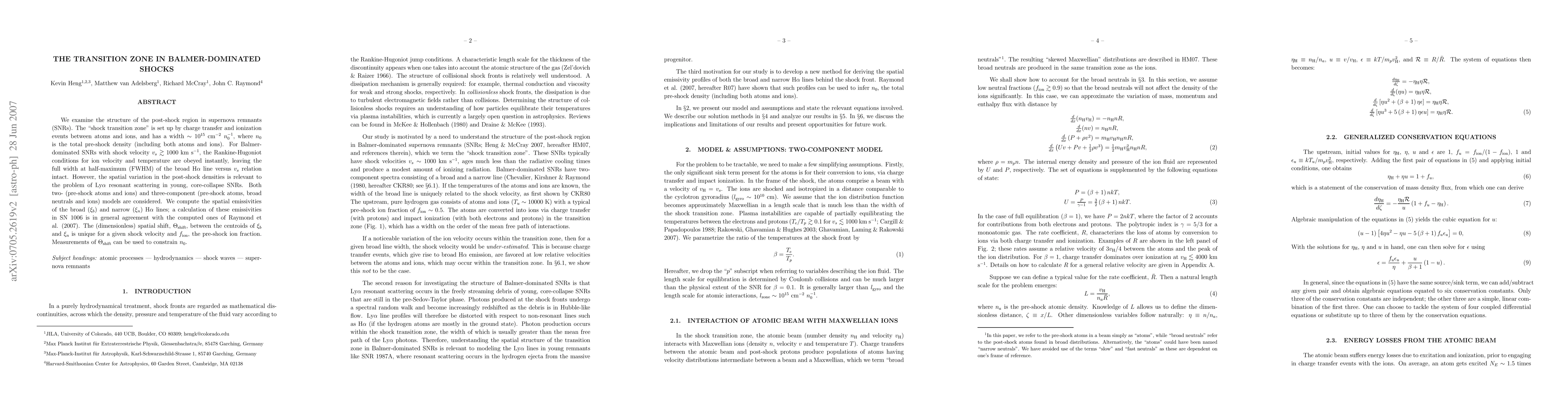 We examine the structure of the post-shock region in supernova remnants (SNRs). The ``shock transition zone'' is set up by charge transfer and ionization events between atoms and ions, and has a width $\sim 10^{15}$ cm$^{-2}$ $n^{-1}_0$, where $n_0$ is the total pre-shock density (including both atoms and ions). For Balmer-dominated SNRs with shock velocity $v_s \gtrsim 1000$ km s$^{-1}$, the Rankine-Hugoniot conditions for ion velocity and temperature are obeyed instantly, leaving the full width at half-maximum (FWHM) of the broad H$\alpha$ line versus $v_s$ relation intact. However, the spatial variation in the post-shock densities is relevant to the problem of Ly$\alpha$ resonant scattering in young, core-collapse SNRs. Both two- (pre-shock atoms and ions) and three-component (pre-shock atoms, broad neutrals and ions) models are considered. We compute the spatial emissivities of the broad ($\xi_b$) and narrow ($\xi_n$) H$\alpha$ lines; a calculation of these emissivities in SN 1006 is in general agreement with the computed ones of Raymond et al. (2007). The (dimensionless) spatial shift, $\Theta_{\rm{shift}}$, between the centroids of $\xi_b$ and $\xi_n$ is unique for a given shock velocity and $f_{\rm{ion}}$, the pre-shock ion fraction. Measurements of $\Theta_{\rm{shift}}$ can be used to constrain $n_0$.