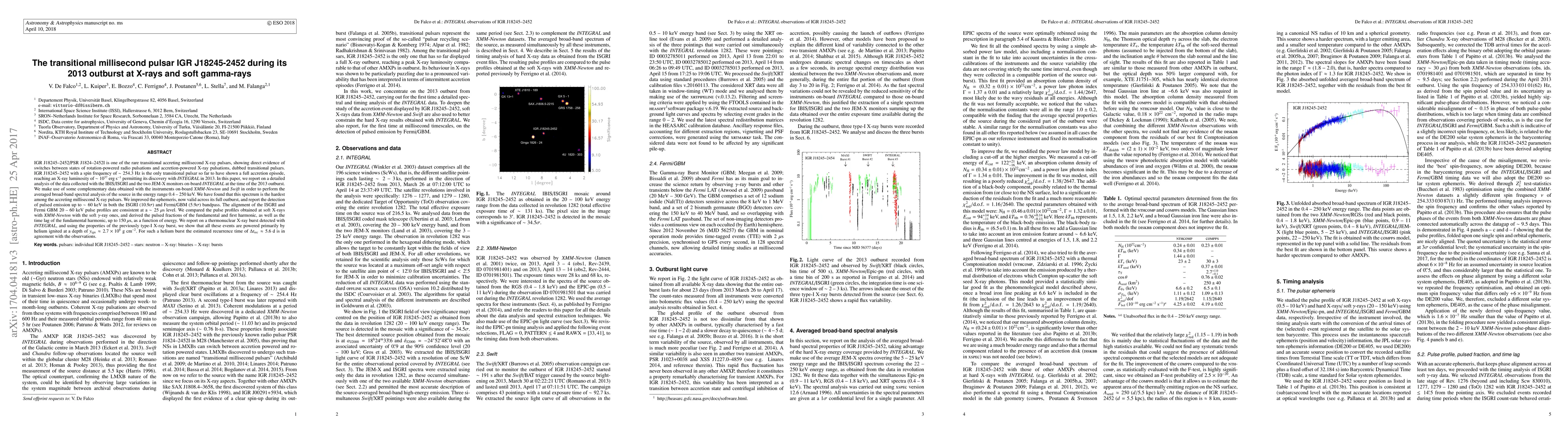 IGR~J18245--2452/PSR J1824--2452I is one of the rare transitional accreting millisecond X-ray pulsars, showing direct evidence of switches between states of rotation powered radio pulsations and accretion powered X-ray pulsations, dubbed transitional pulsars. IGR~J18245--2452 is the only transitional pulsar so far to have shown a full accretion episode, reaching an X-ray luminosity of $\sim10^{37}$~erg~s$^{-1}$ permitting its discovery with INTEGRAL in 2013. In this paper, we report on a detailed analysis of the data collected with the IBIS/ISGRI and the two JEM-X monitors on-board INTEGRAL at the time of the 2013 outburst. We make use of some complementary data obtained with the instruments on-board XMM-Newton and Swift in order to perform the averaged broad-band spectral analysis of the source in the energy range 0.4 -- 250~keV. We have found that this spectrum is the hardest among the accreting millisecond X-ray pulsars. We improved the ephemeris, now valid across its full outburst, and report the detection of pulsed emission up to $\sim60$ keV in both the ISGRI ($10.9 \sigma$) and Fermi/GBM ($5.9 \sigma$) bandpass. The alignment of the ISGRI and Fermi GBM 20 -- 60 keV pulse profiles are consistent at a $\sim25\ \mu$s level. We compared the pulse profiles obtained at soft X-rays with \xmm\ with the soft \gr-ray ones, and derived the pulsed fractions of the fundamental and first harmonic, as well as the time lag of the fundamental harmonic, up to $150\ \mu$s, as a function of energy. We report on a thermonuclear X-ray burst detected with \Integ, and using the properties of the previously type-I X-ray burst, we show that all these events are powered primarily by helium ignited at a depth of $y_{\rm ign} \approx 2.7\times10^8$ g cm${}^{-2}$. For such a helium burst the estimated recurrence time of $\Delta t_{\rm rec}\approx5.6$ d is in agreement with the observations.