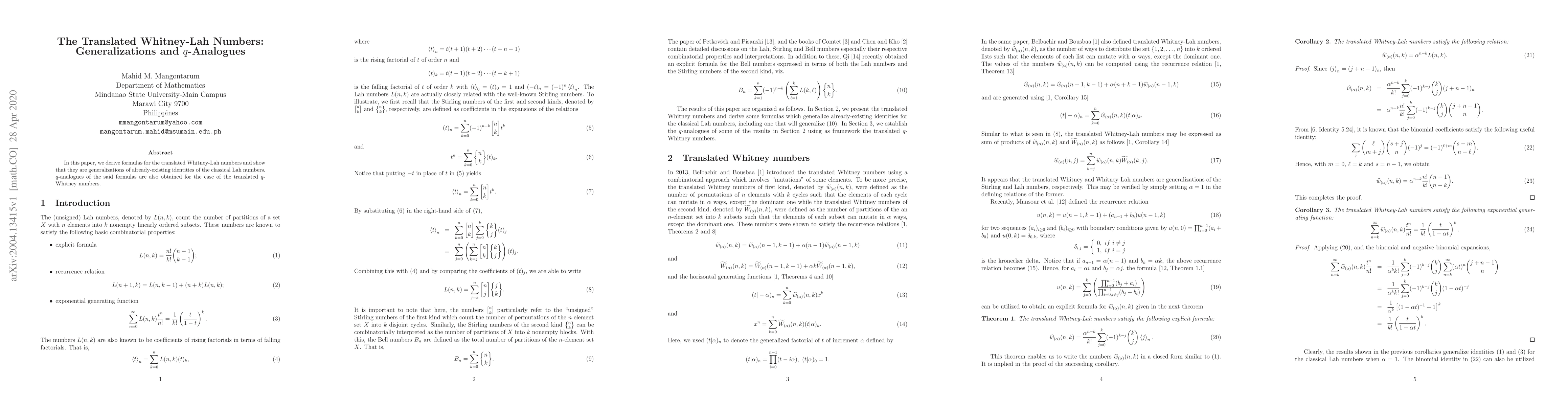 In this paper, we derive formulas for the translated Whitney-Lah numbers and show that they are generalizations of already-existing identities of the classical Lah numbers. q-analogues of the said formulas are also obtained for the case of the translated q-Whitney numbers.