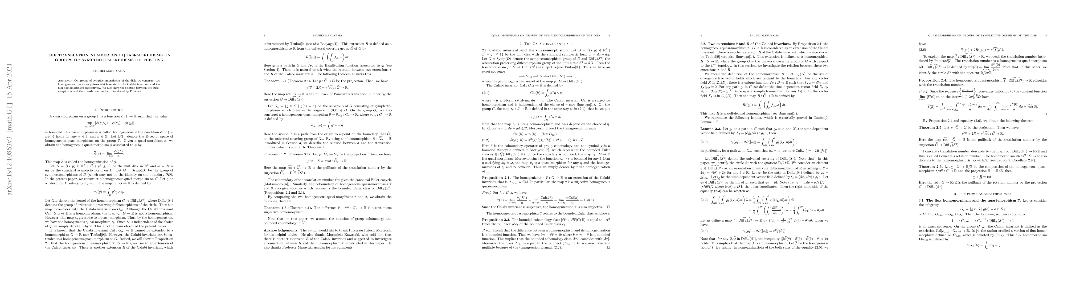 Summary: This paper constructs two homogeneous quasi-morphisms on groups of symplectomorphisms of the disk, linking them to the Calabi invariant and the flux homomorphism, and explores their relationship with Poincaré's translation number.