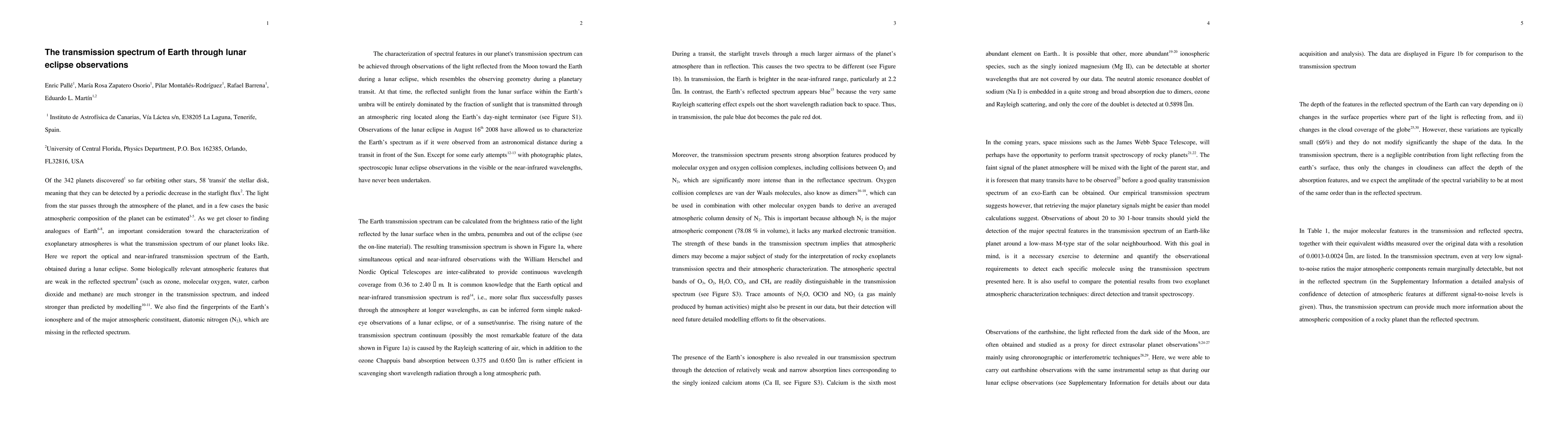 This study reports the Earth's optical and near-infrared transmission spectrum during a lunar eclipse, revealing stronger biologically relevant atmospheric features than predicted. It identifies the fingerprints of the Earth's ionosphere and major atmospheric constituent, diatomic nitrogen (N2), which are absent in the reflected spectrum.