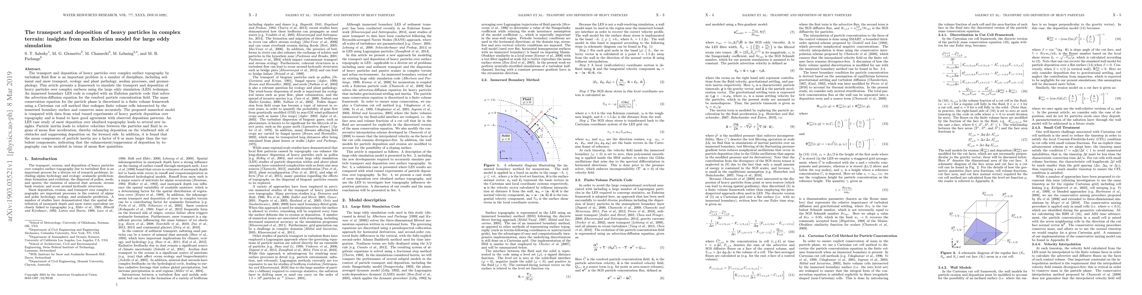 This paper presents a numerical model using large eddy simulation to simulate the transport and deposition of heavy particles over complex terrain, showing good agreement with wind tunnel experiments. Insights reveal that particle inertia enhances deposition on windward sides and suppresses it on leeward sides, with mean flow components significantly influencing deposition patterns.