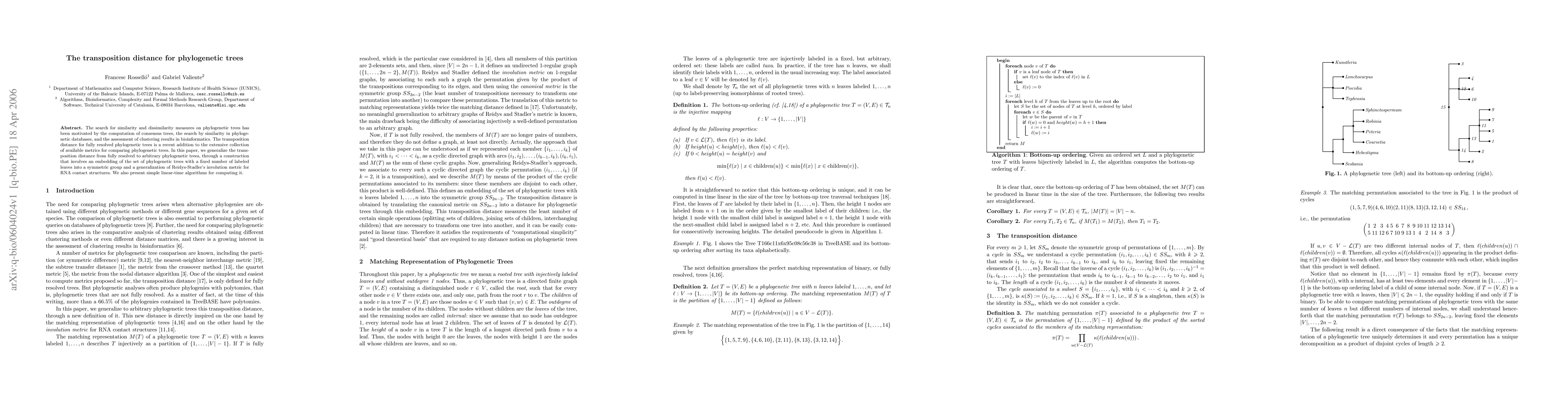 This paper generalizes the transposition distance for phylogenetic trees from fully resolved to arbitrary trees, employing an embedding into a symmetric group and a modified involution metric. It also provides efficient linear-time algorithms for its computation.