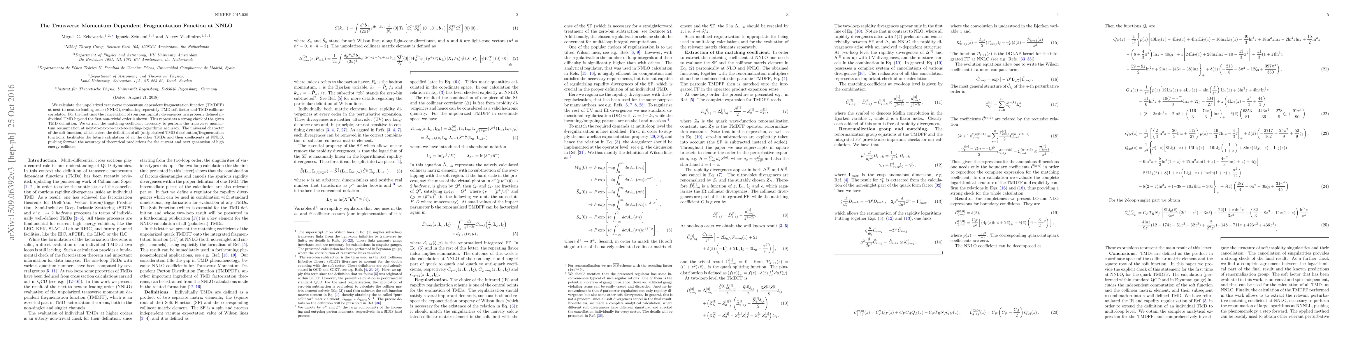 We calculate the unpolarized transverse momentum dependent fragmentation function (TMDFF) at next-to-next-to-leading order (NNLO), evaluating separately TMD soft factor and TMD collinear correlator. For the first time the cancellation of spurious rapidity divergences in a properly defined individual TMD beyond the first non-trivial order is shown. This represents a strong check of the given TMD definition. We extract the matching coefficient necessary to perform the transverse momentum resummation at next-to-next-to-next-to-leading-logarithmic accuracy. The universal character of the soft function, which enters the definition of all (un)polarized TMD distribution/fragmentation functions, facilitates the future calculation of all the other TMDs and their coefficients at NNLO, pushing forward the accuracy of theoretical predictions for the current and next generation of high energy colliders.