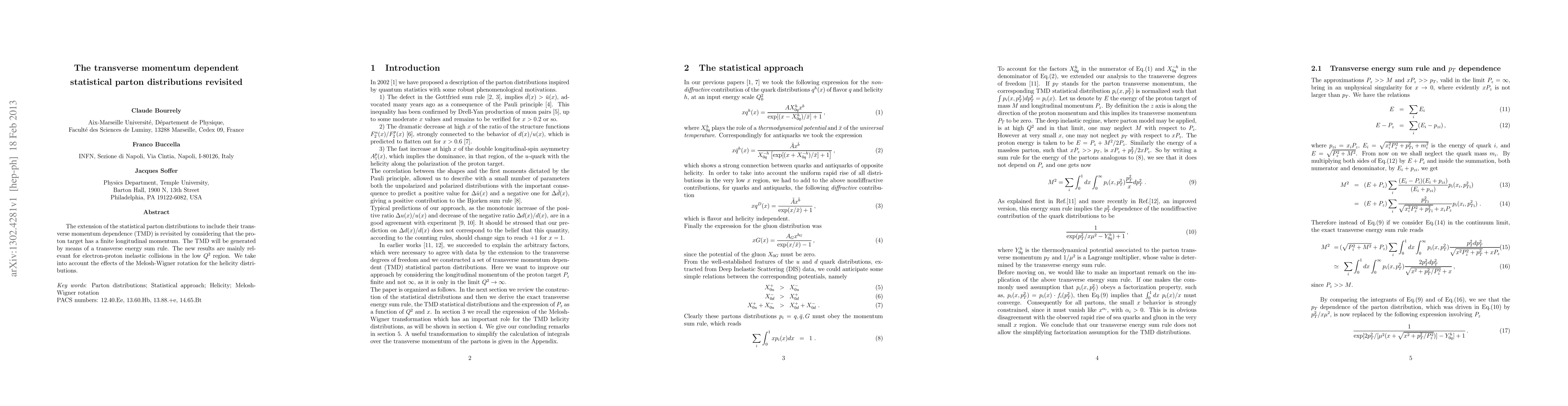 This paper revisits the statistical parton distributions with transverse momentum dependence (TMD) for finite proton longitudinal momentum, generating TMD via a transverse energy sum rule. The findings are significant for low $Q^2$ electron-proton collisions, incorporating the Melosh-Wigner rotation effects on helicity distributions.