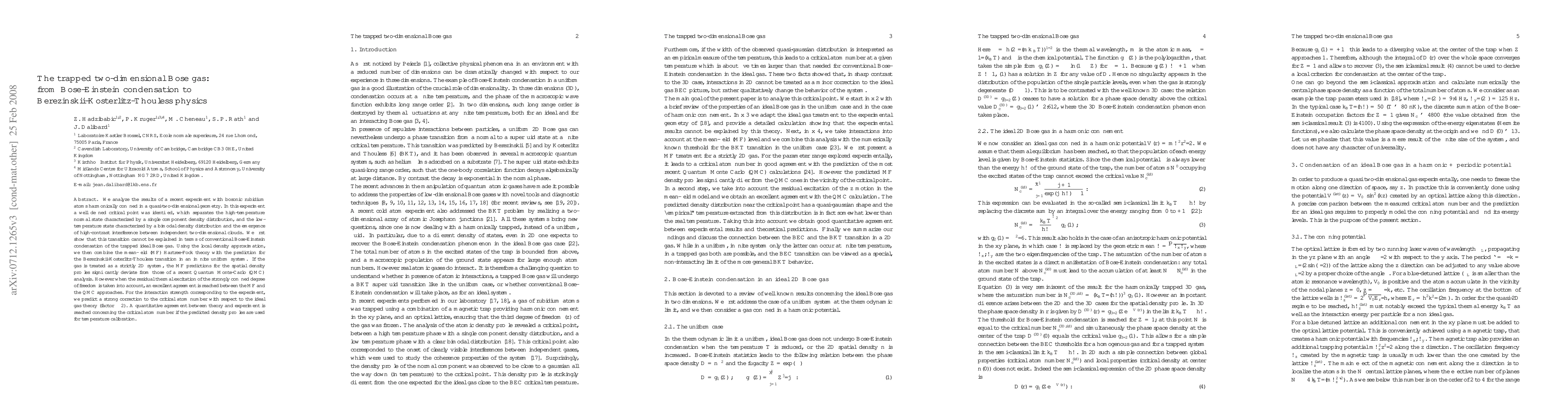 This paper investigates a trapped two-dimensional Bose gas of rubidium atoms, identifying a critical point that transitions from a normal state to a state with bimodal density distribution and interference. The transition is not explained by conventional Bose-Einstein condensation but aligns with Berezinskii-Kosterlitz-Thouless physics when thermal excitations are considered, showing a strong correction to the critical atom number.