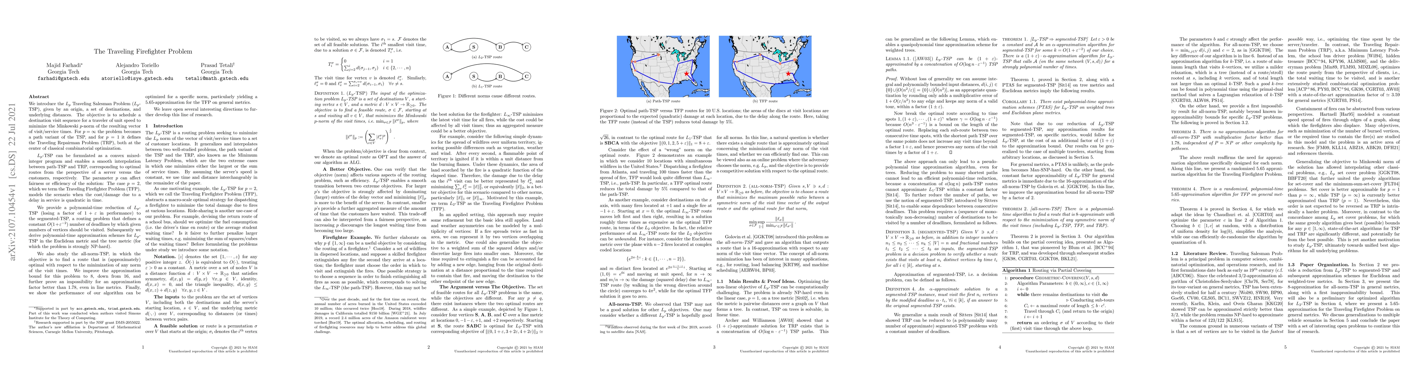 We introduce the $L_p$ Traveling Salesman Problem ($L_p$-TSP), given by an origin, a set of destinations, and underlying distances. The objective is to schedule a destination visit sequence for a traveler of unit speed to minimize the Minkowski $p$-norm of the resulting vector of visit/service times. For $p = \infty$ the problem becomes a path variant of the TSP, and for $p = 1$ it defines the Traveling Repairman Problem (TRP), both at the center of classical combinatorial optimization. We provide an approximation preserving polynomial-time reduction of $L_p$-TSP to the segmented-TSP Problem [Sitters '14] and further study the case of $p = 2$, which we term the Traveling Firefighter Problem (TFP), when the cost due to a delay in service is quadratic in time. We also study the all-norm-TSP problem [Golovin et al. '08], in which the objective is to find a route that is (approximately) optimal with respect to the minimization of any norm of the visit times, and improve corresponding (in)approximability bounds on metric spaces.