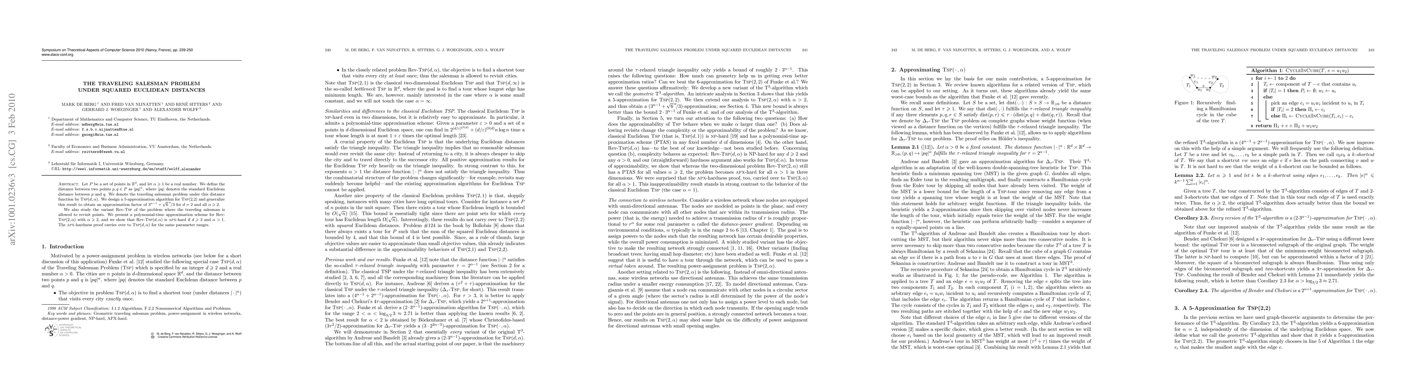 This paper addresses the Traveling Salesman Problem (TSP) under squared Euclidean distances, presenting a 5-approximation algorithm for TSP(2,2) and a generalized approximation factor for TSP(2,α) with α ≥ 2. It also introduces a polynomial-time approximation scheme for the revisitable variant Rev-TSP(2,α) and proves APX-hardness for higher dimensions and α > 1.