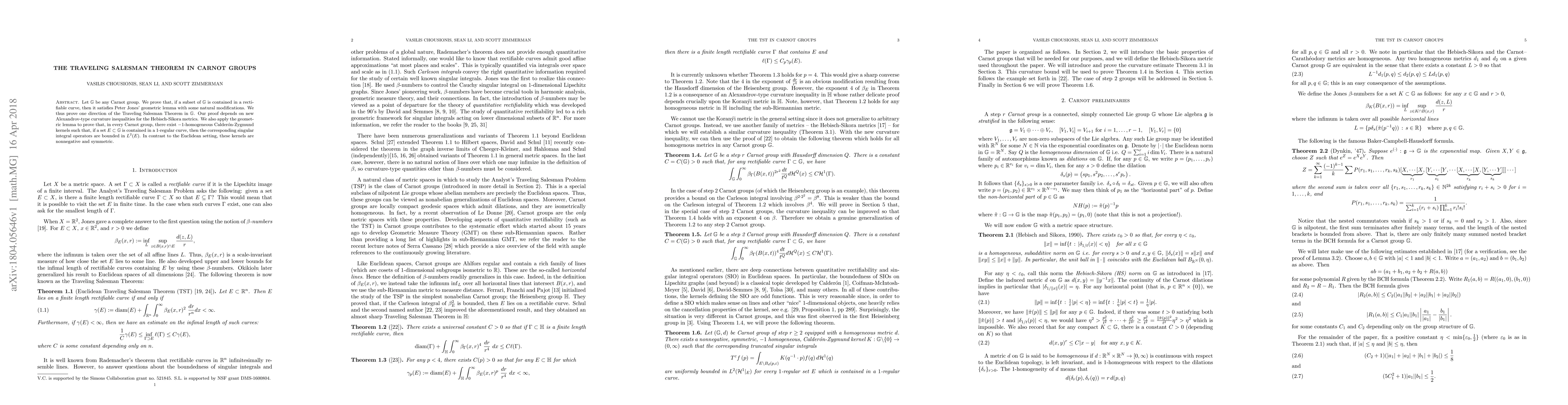 Let $\mathbb{G}$ be any Carnot group. We prove that, if a subset of $\mathbb{G}$ is contained in a rectifiable curve, then it satisfies Peter Jones' geometric lemma with some natural modifications. We thus prove one direction of the Traveling Salesman Theorem in $\mathbb{G}$. Our proof depends on new Alexandrov-type curvature inequalities for the Hebisch-Sikora metrics. We also apply the geometric lemma to prove that, in every Carnot group, there exist $-1$-homogeneous Calder\'on-Zygmund kernels such that, if a set $E \subset \mathbb{G}$ is contained in a 1-regular curve, then the corresponding singular integral operators are bounded in $L^2(E)$. In contrast to the Euclidean setting, these kernels are nonnegative and symmetric.