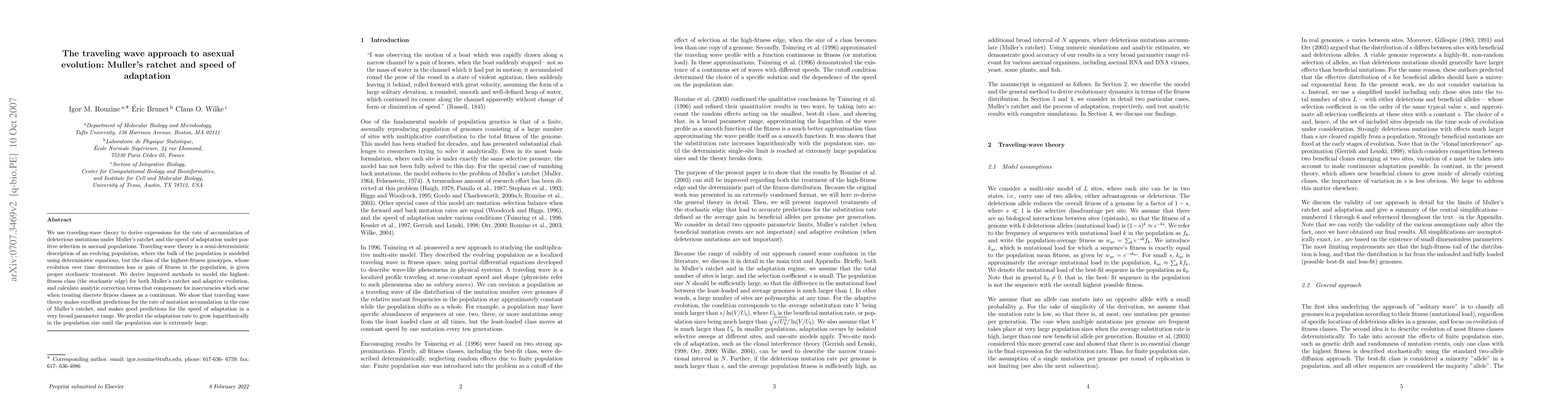 This paper employs traveling-wave theory to model the rate of deleterious mutation accumulation under Muller's ratchet and the speed of adaptation in asexual populations, showing that it provides accurate predictions for both scenarios, with adaptation rates growing logarithmically with population size.
