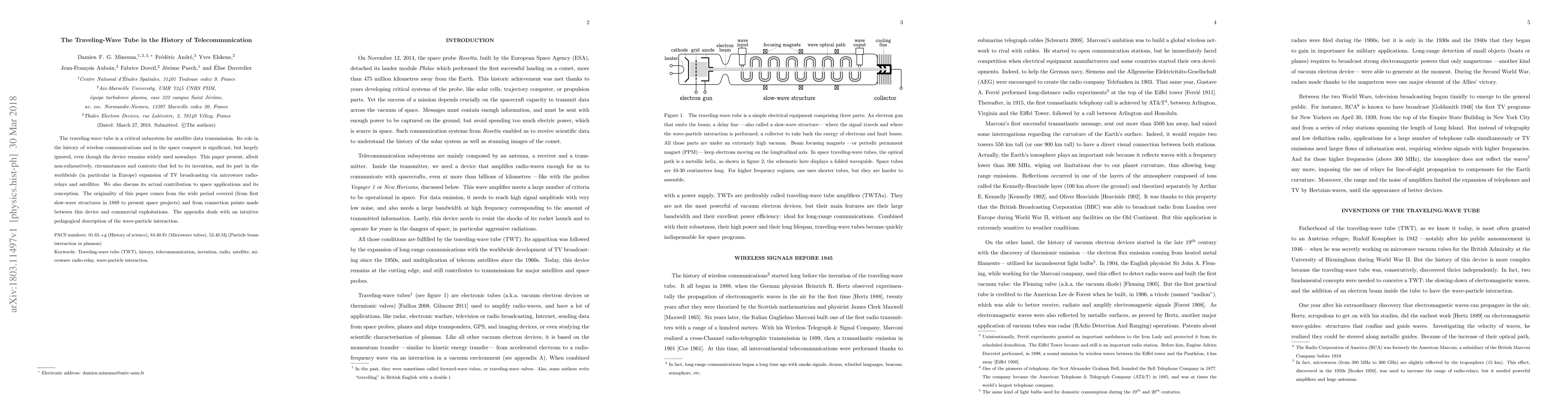 The traveling-wave tube is a critical subsystem for satellite data transmission. Its role in the history of wireless communications and in the space conquest is significant, but largely ignored, even though the device remains widely used nowadays. This paper present, albeit non-exhaustively, circumstances and contexts that led to its invention, and its part in the worldwide (in particular in Europe) expansion of TV broadcasting via microwave radio-relays and satellites. We also discuss its actual contribution to space applications and its conception. The originality of this paper comes from the wide period covered (from first slow-wave structures in 1889 to present space projects) and from connection points made between this device and commercial exploitations. The appendix deals with an intuitive pedagogical description of the wave-particle interaction.