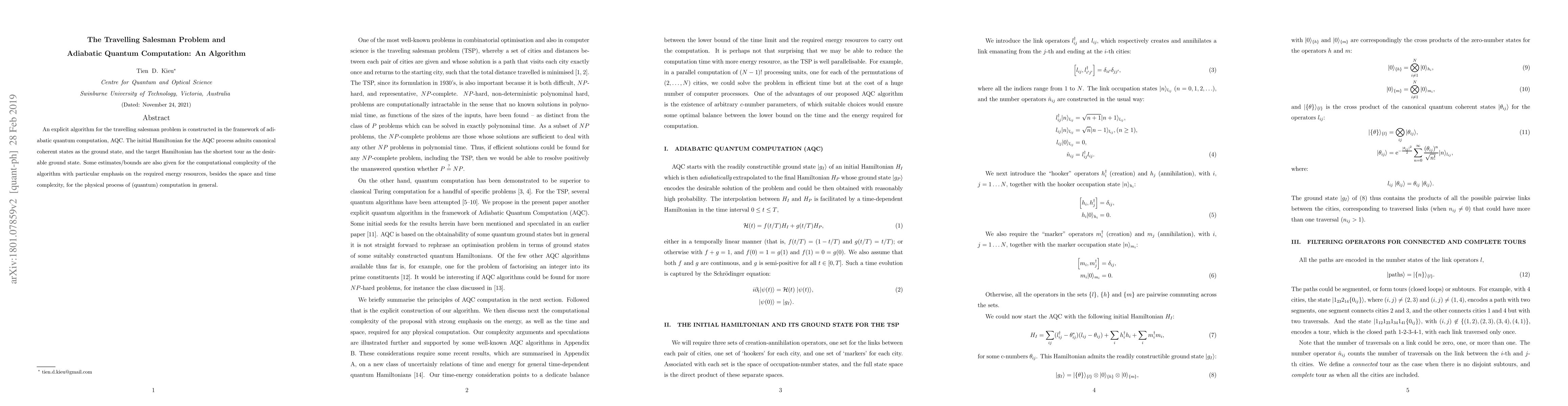 An explicit algorithm for the travelling salesman problem is constructed in the framework of adiabatic quantum computation, AQC. The initial Hamiltonian for the AQC process admits canonical coherent states as the ground state, and the target Hamiltonian has the shortest tour as the desirable ground state. Some estimates/bounds are also given for the computational complexity of the algorithm with particular emphasis on the required energy resources, besides the space and time complexity, for the physical process of (quantum) computation in general.