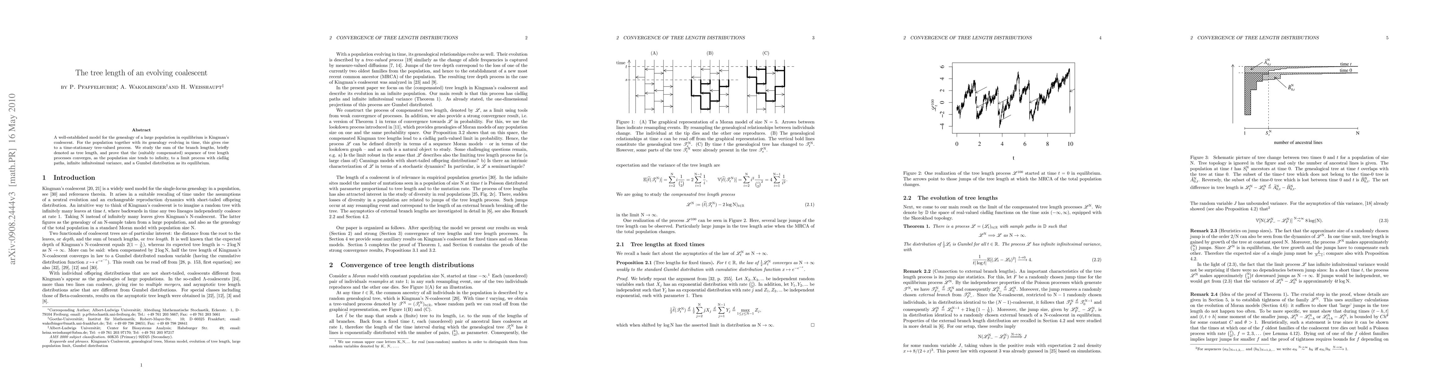 This paper investigates the evolving coalescent model for population genealogy, focusing on the sum of branch lengths, termed tree length. It demonstrates that as population size increases, the tree length process converges to a limit with cadlag paths, infinite variance, and a Gumbel distribution at equilibrium.