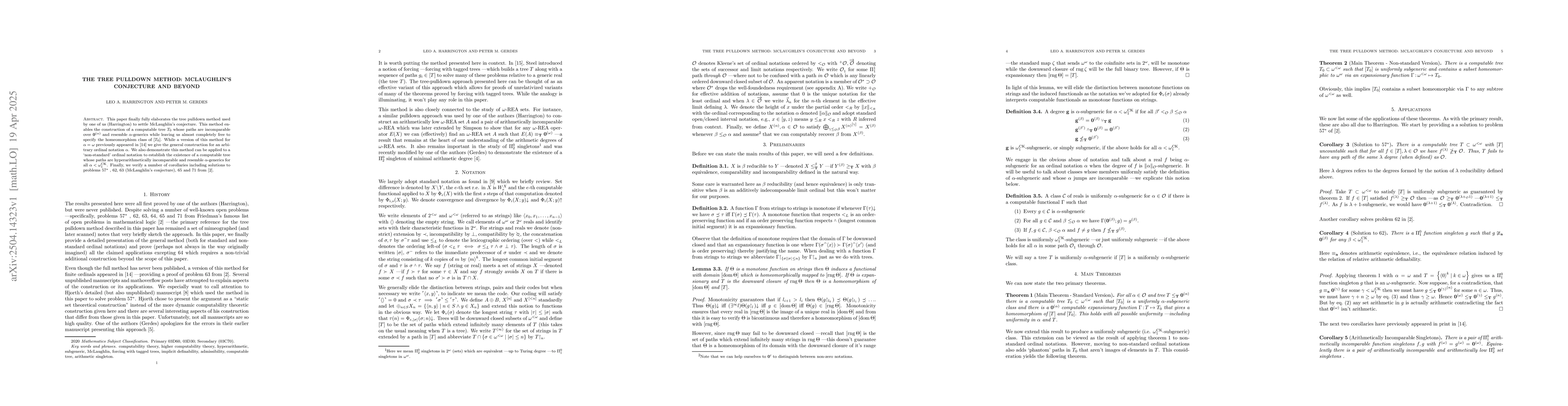 The paper details the tree pulldown method, initially used by Harrington to resolve McLaughlin's conjecture, and extends this method to arbitrary ordinal notations α, providing a general construction.